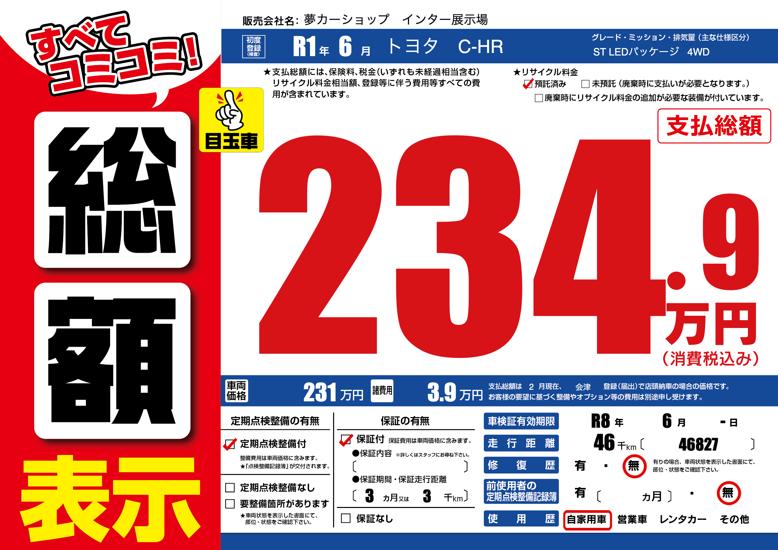 | 車名 | トヨタ C-HR | グレード ミッション 排気量 |
