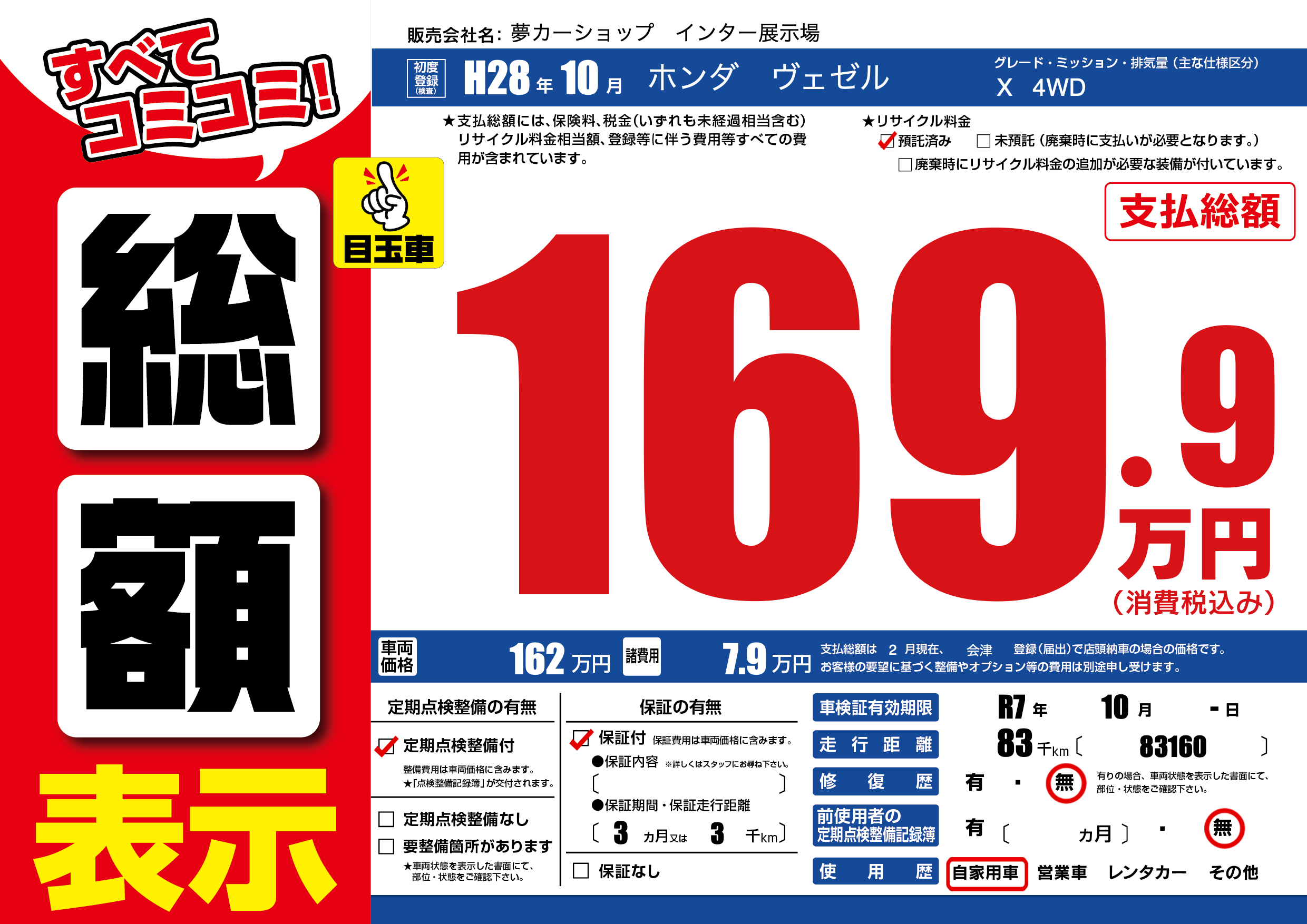 | 車名 | ホンダ ヴェゼル | グレード ミッション 排気量 |