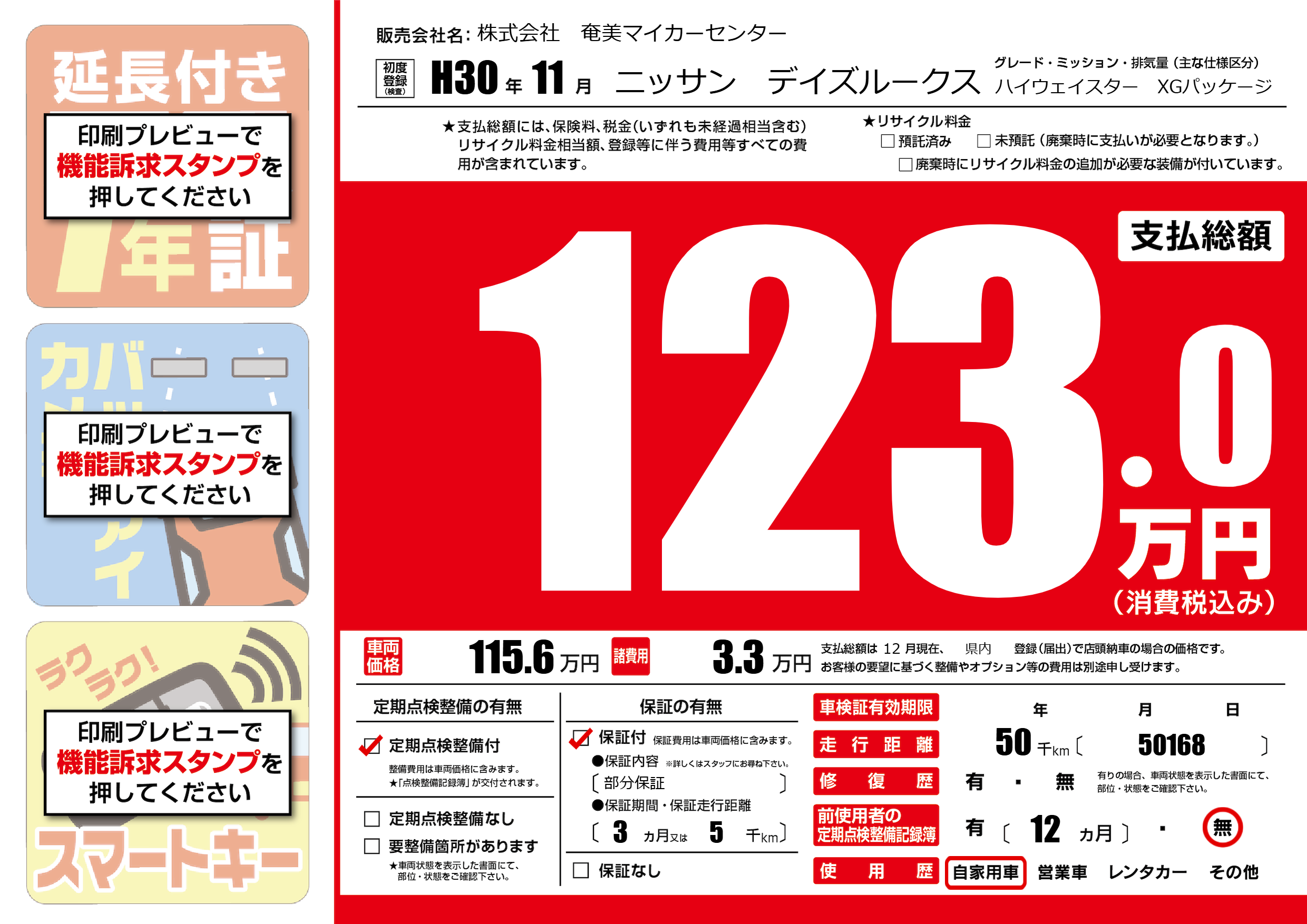 | 走行キロ | 5万km | 初年度登録 | H30年11月 |