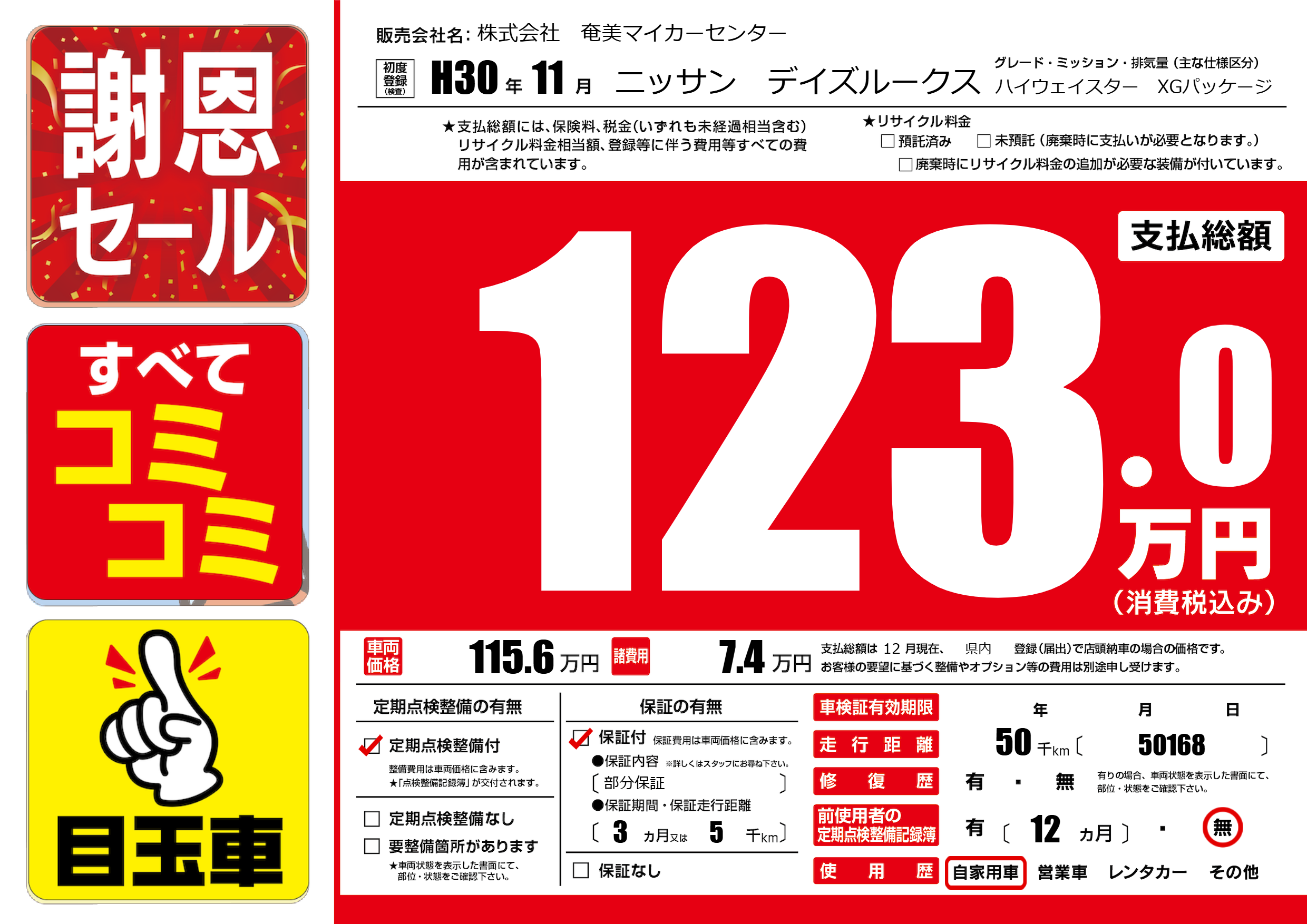 | 走行キロ | 5万km | 初年度登録 | H30年11月 |