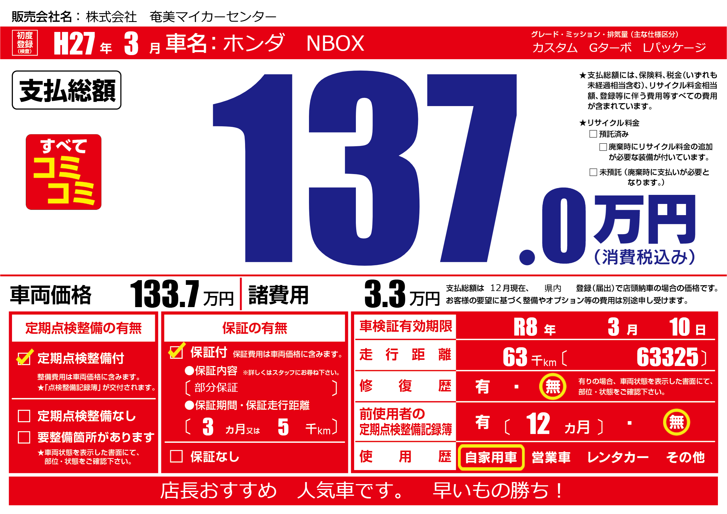| 車検制限 | R8年 3月 10日 | ||