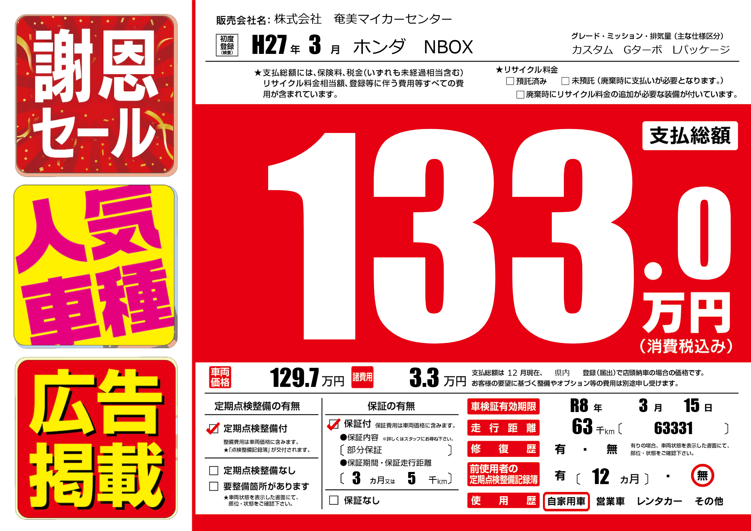 | 走行キロ | 6.3万km | 初年度登録 | H27年3月 |