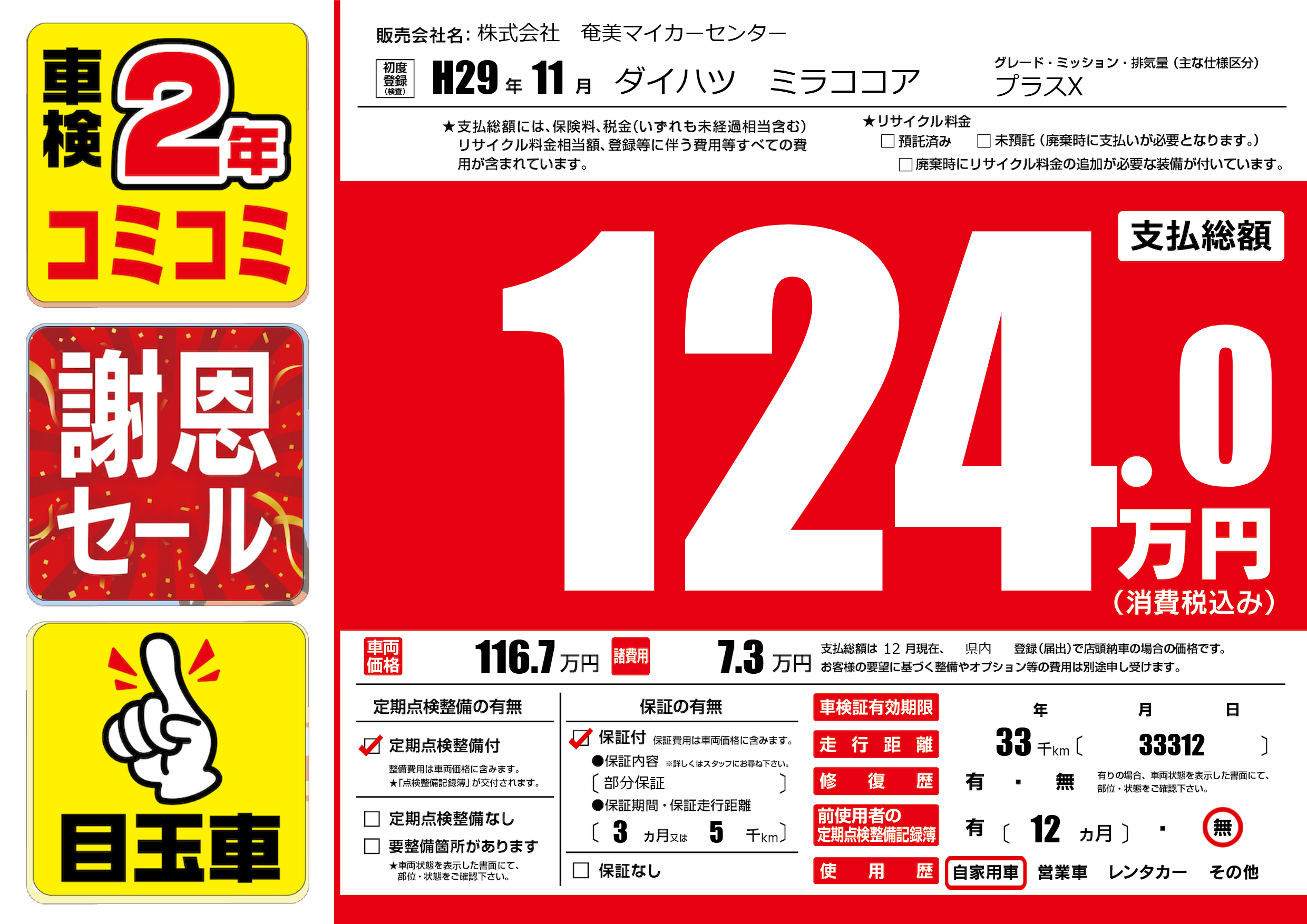 | 走行キロ | 3.3万km | 初年度登録 | H29年11月 |