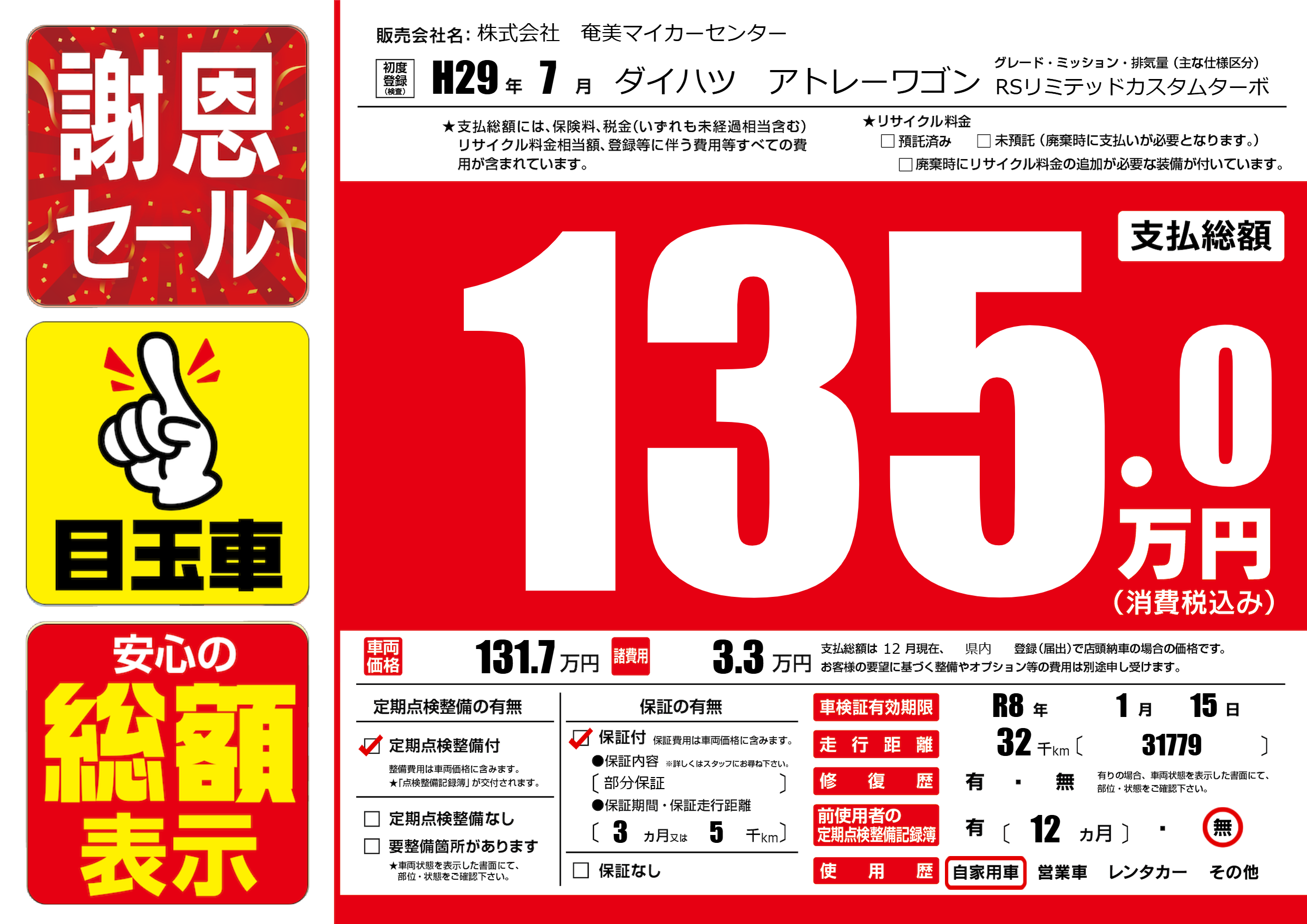 | 走行キロ | 3.2万km | 初年度登録 | H29年7月 |