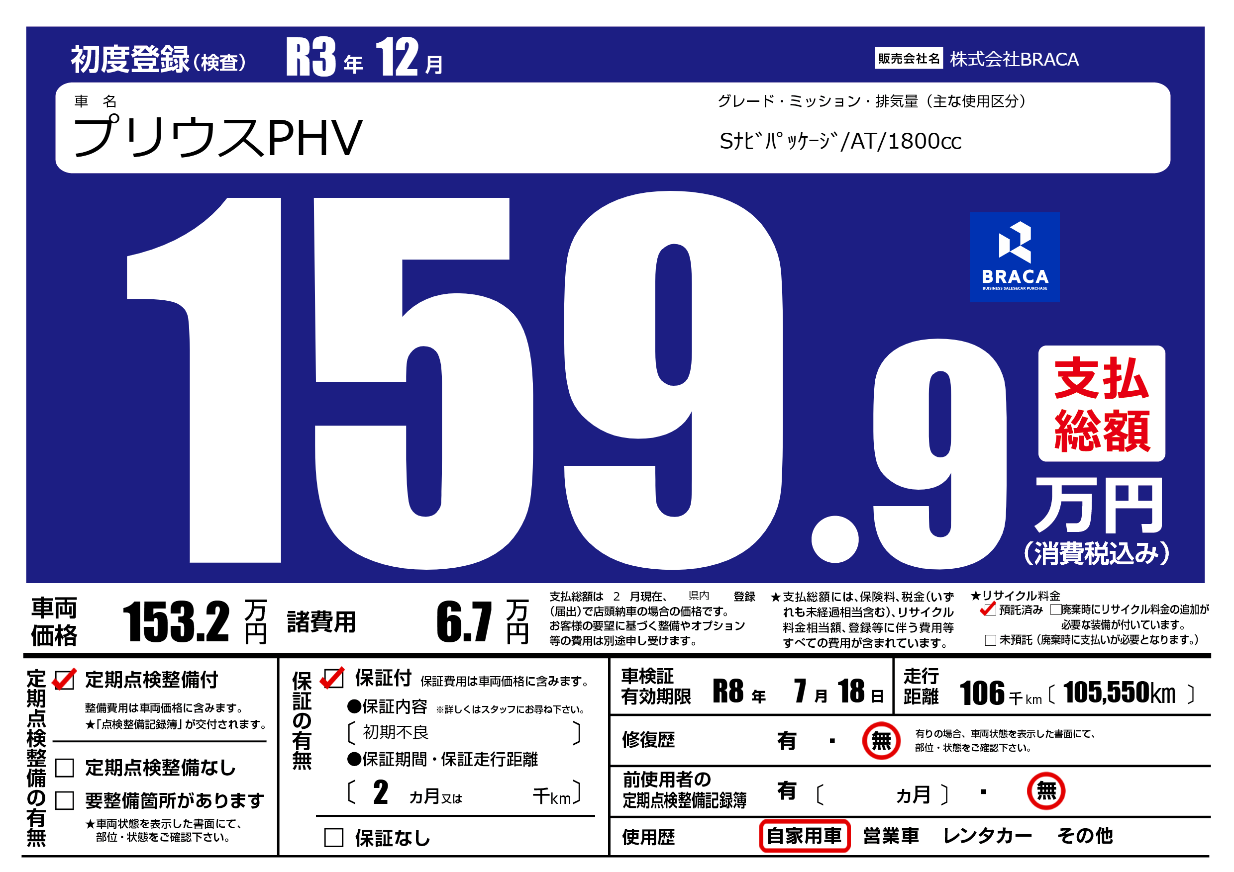 | 車名 | プリウスPHV | グレード ミッション 排気量 |
