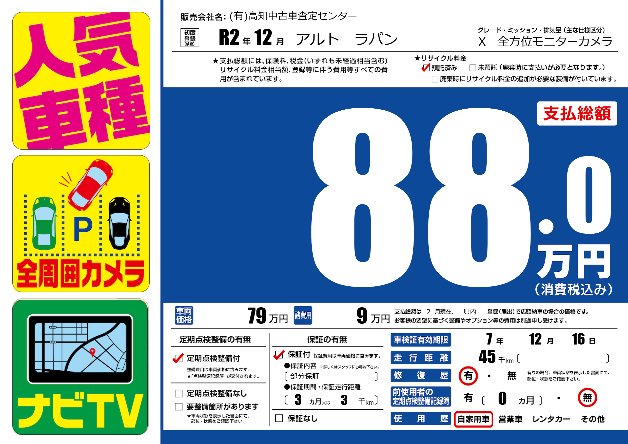 | 車名 | アルト ラパン | グレード ミッション 排気量 |