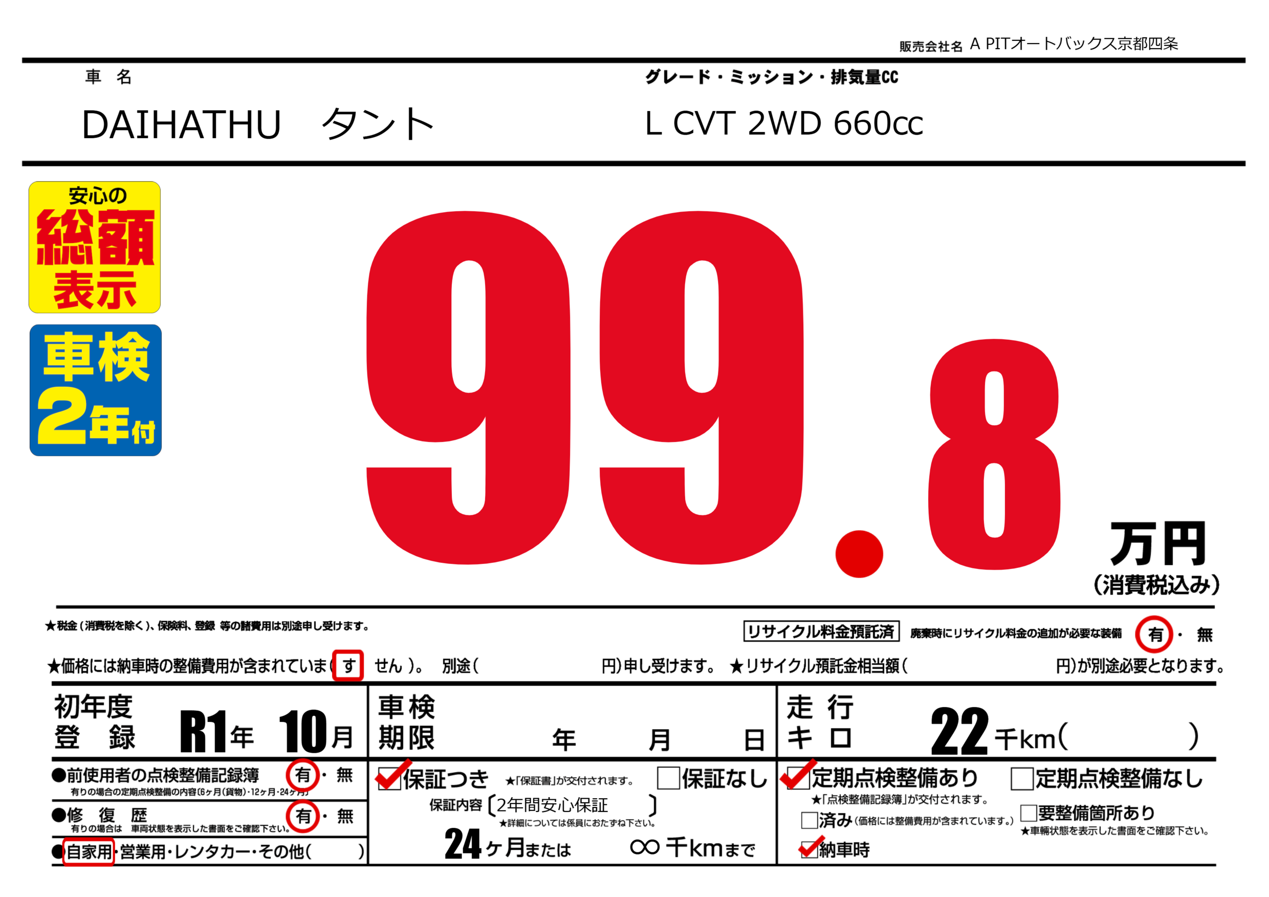 | 車名 | DAIHATHU タント | グレード ミッション 排気量 |