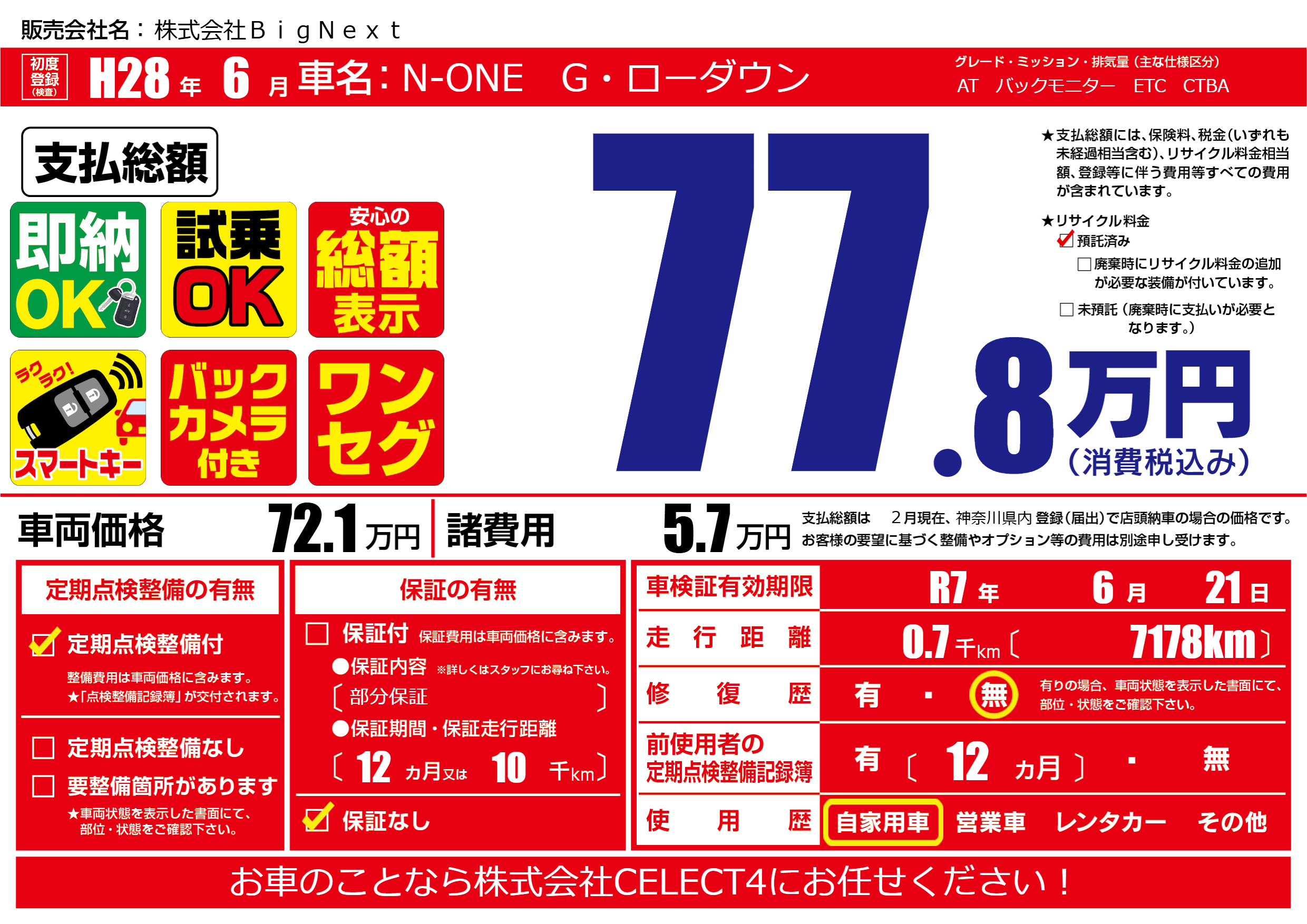 | 車名 | N-ONE G・ローダウン | グレード ミッション 排気量 |