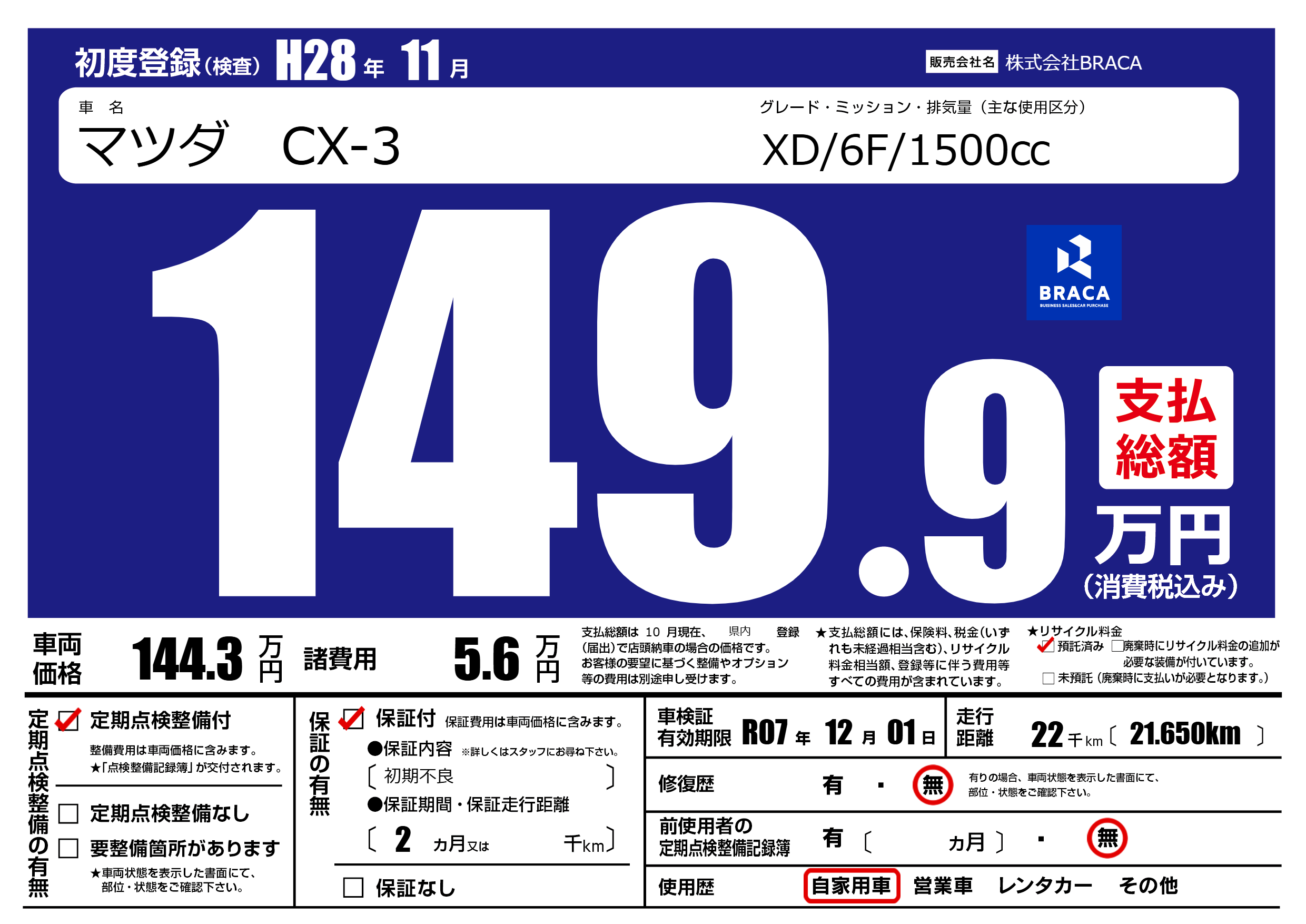 | 車名 | マツダ CX-3 | グレード ミッション 排気量 |