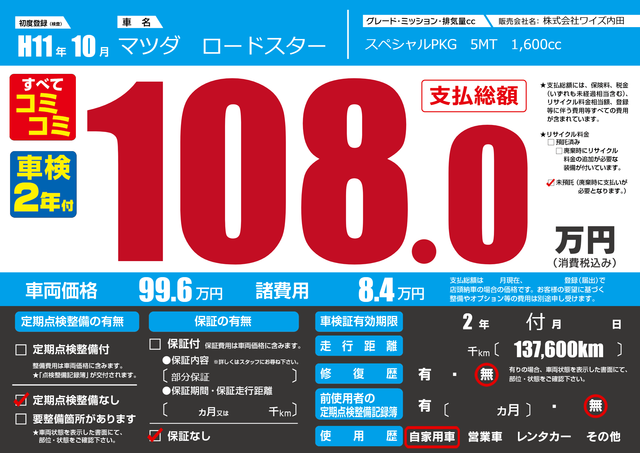 | 車検制限 | 2年 付月 - 日 | ||