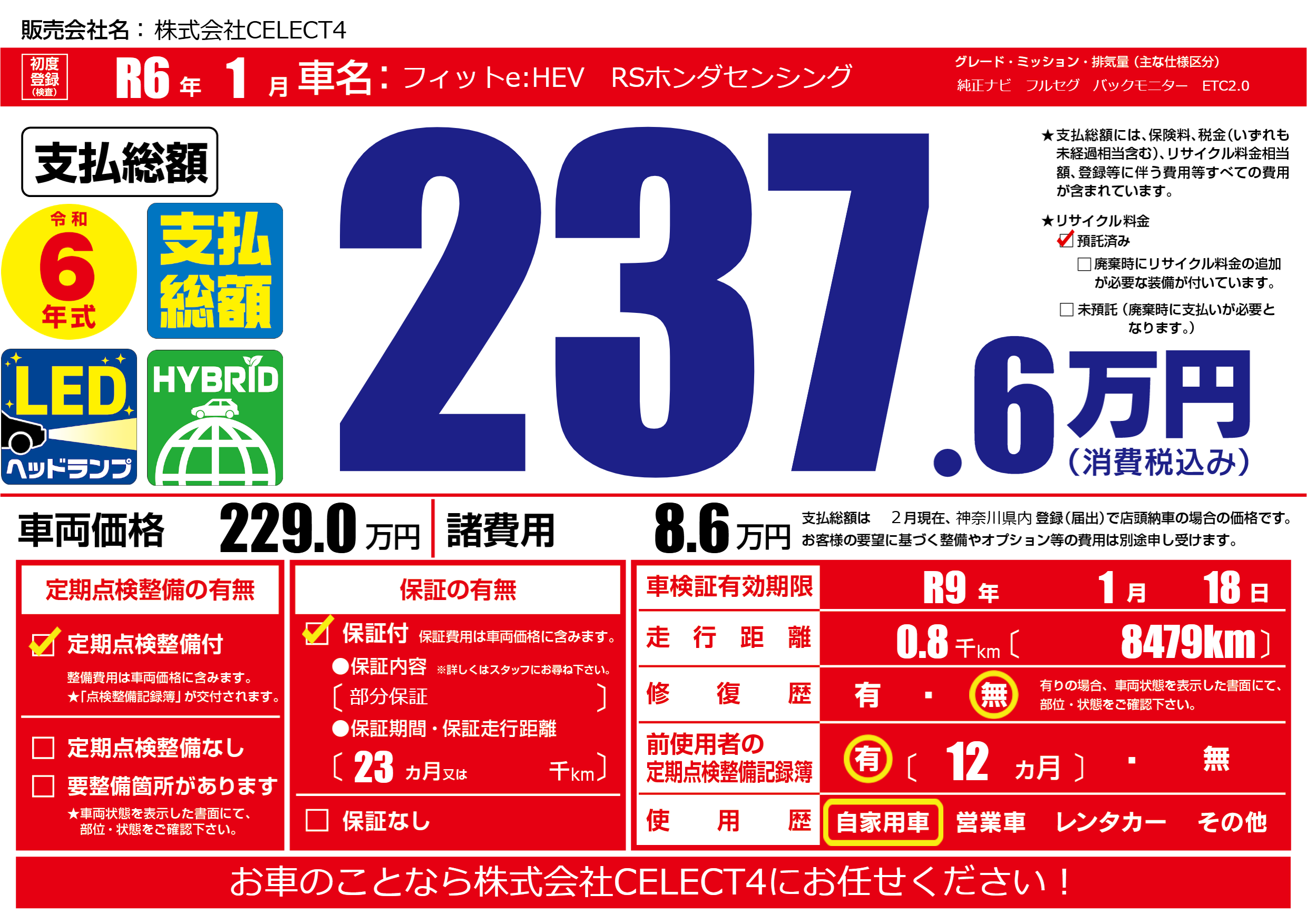 | 車名 | フィットe:HEV RSホンダセンシング | グレード ミッション 排気量 |