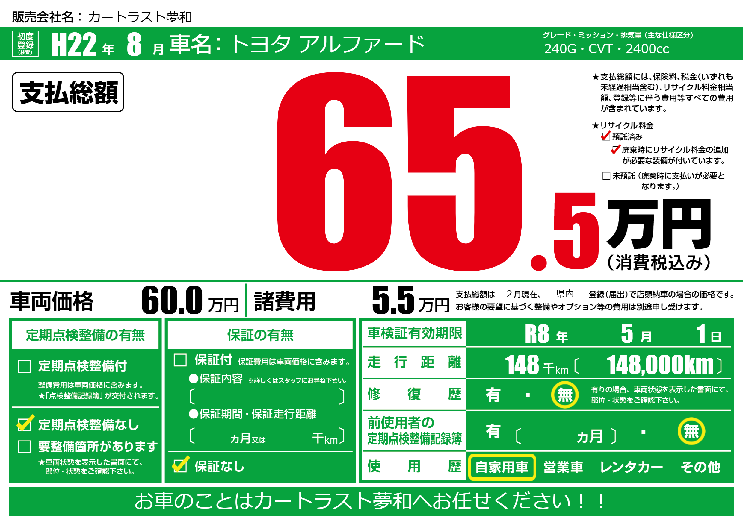 | 走行キロ | 14.8万km | 初年度登録 | H22年8月 |
