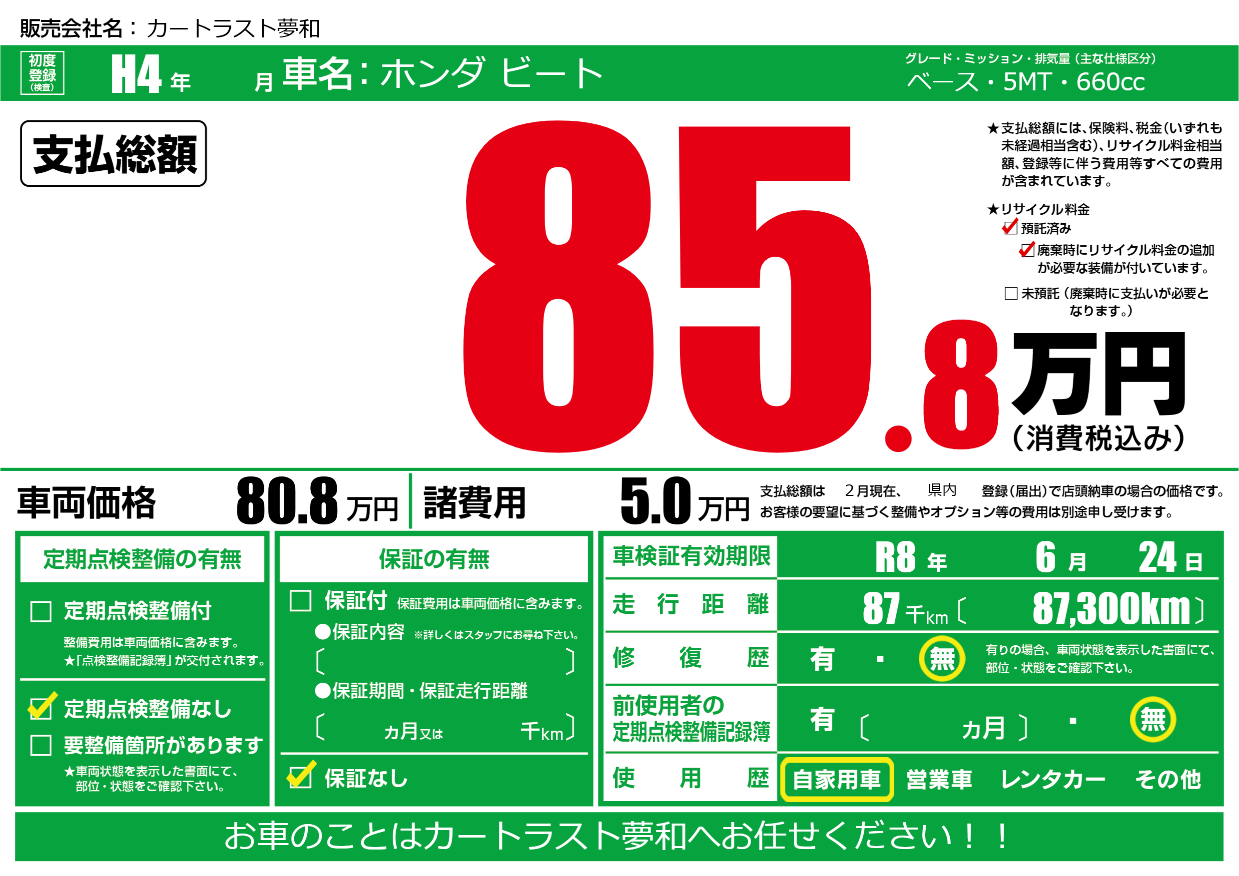 | 車名 | ホンダ ビート | グレード ミッション 排気量 |