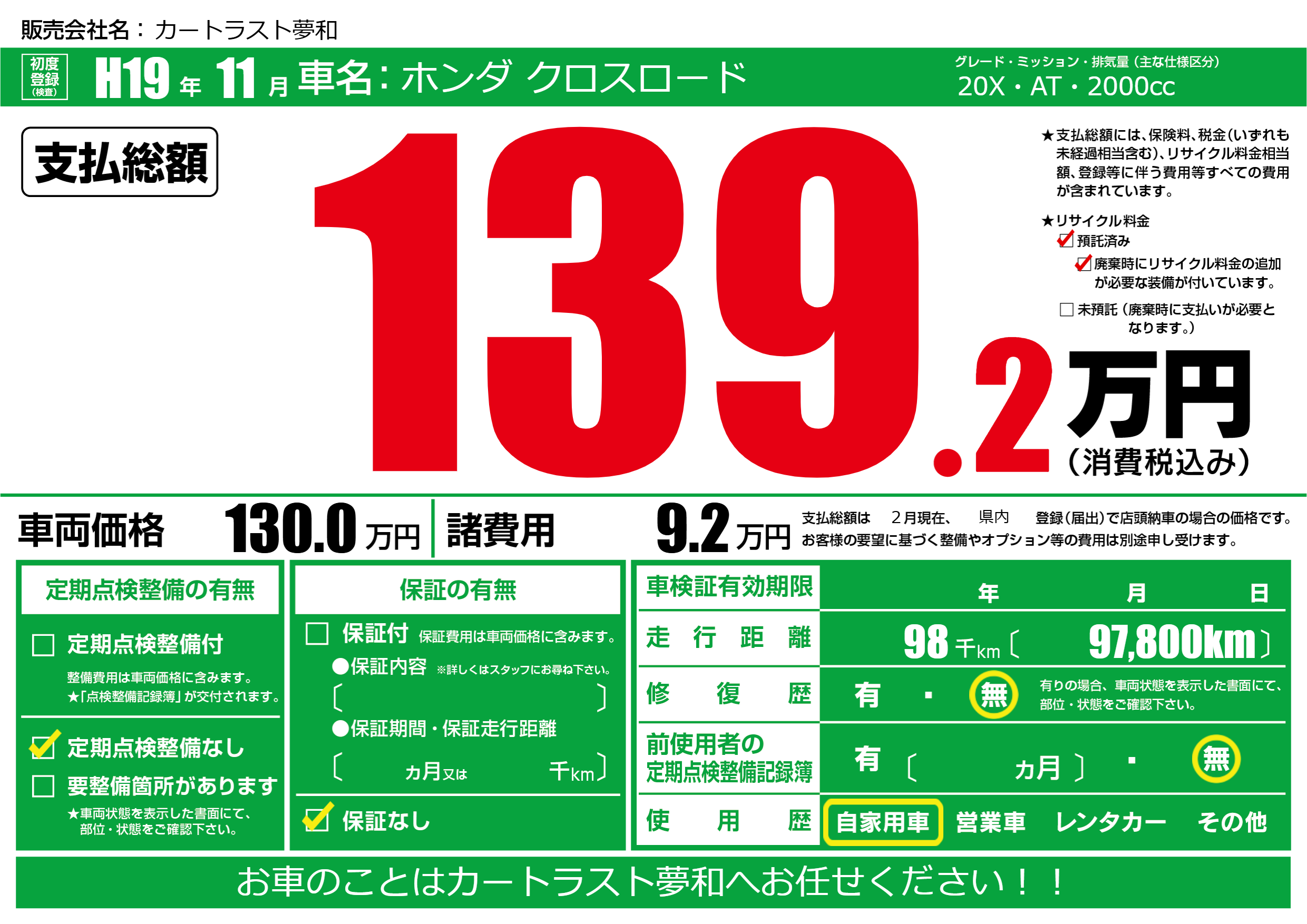 | 走行キロ | 9.8万km | 初年度登録 | H19年11月 |