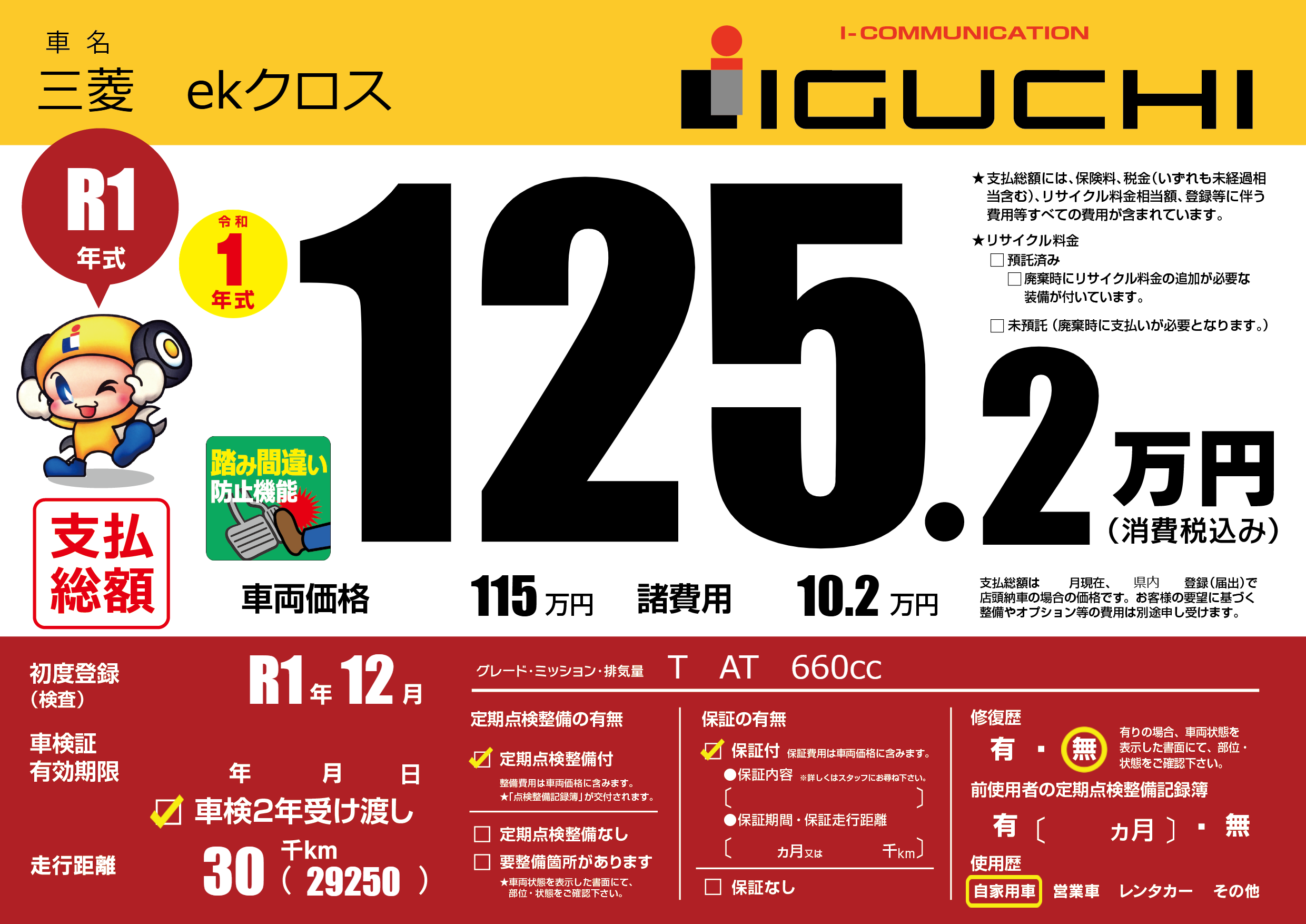 | 走行キロ | 3万km | 初年度登録 | R1年12月 |