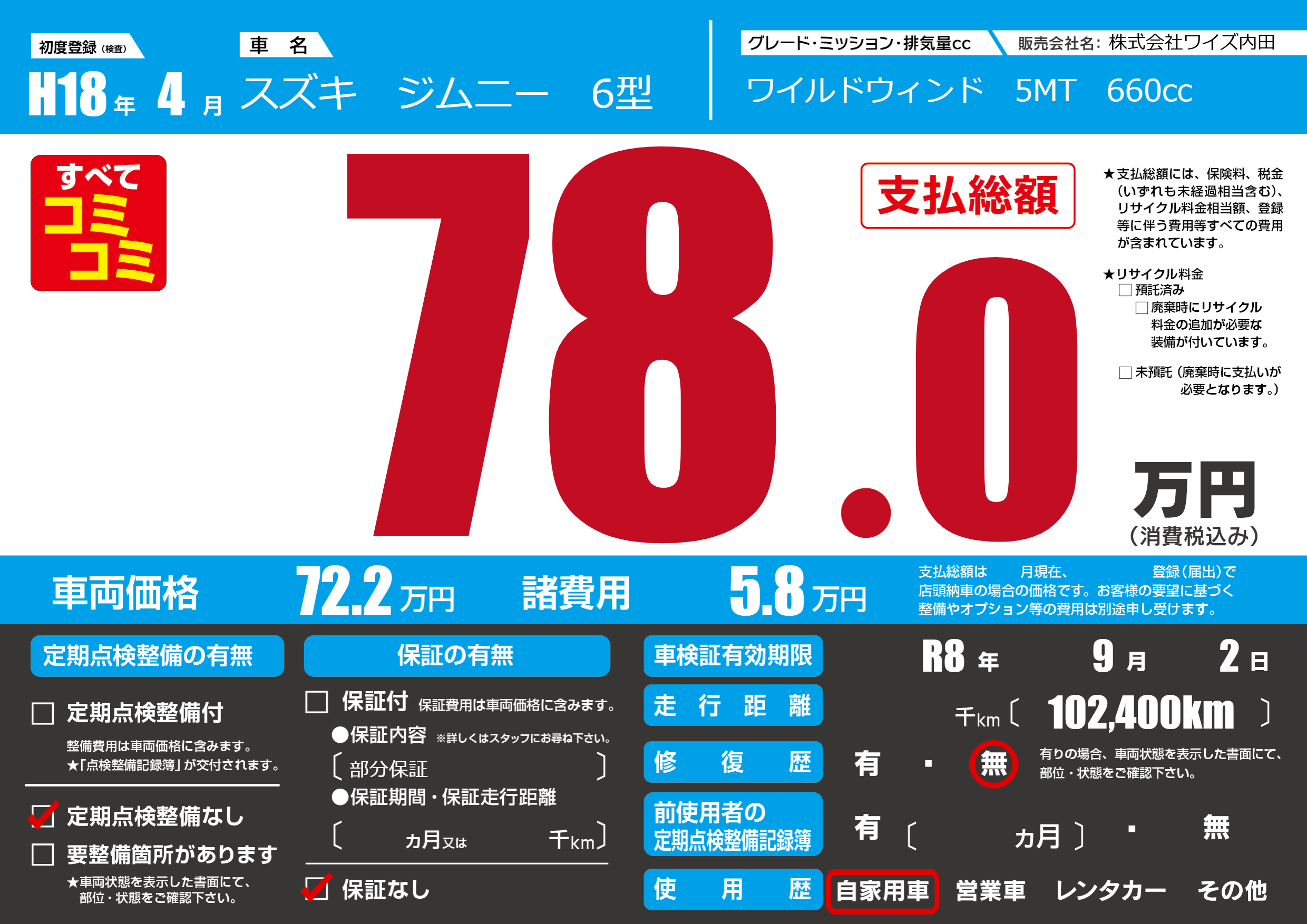 | 車検制限 | R8年 9月 2日 | ||