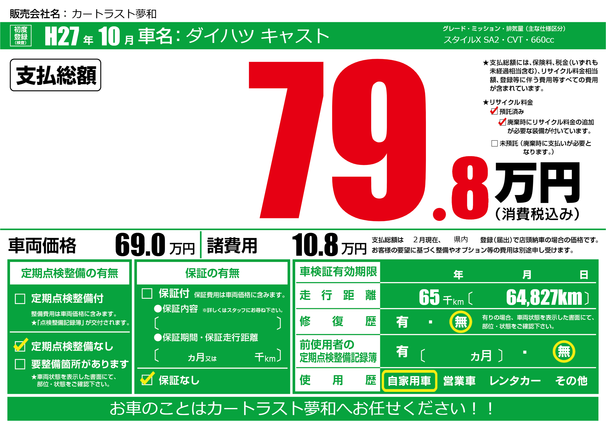 | 車名 | ダイハツ キャスト | グレード ミッション 排気量 |