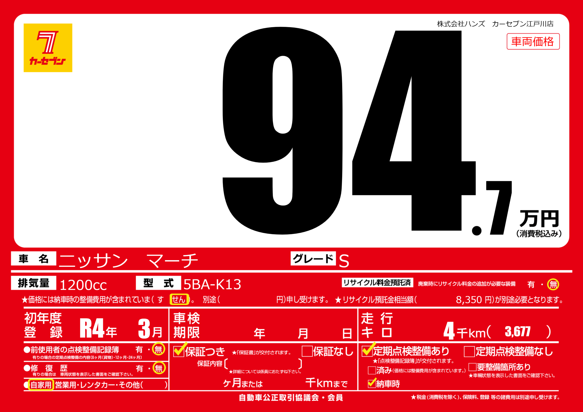 | 車名 | ニッサン マーチ | グレード ミッション 排気量 |
