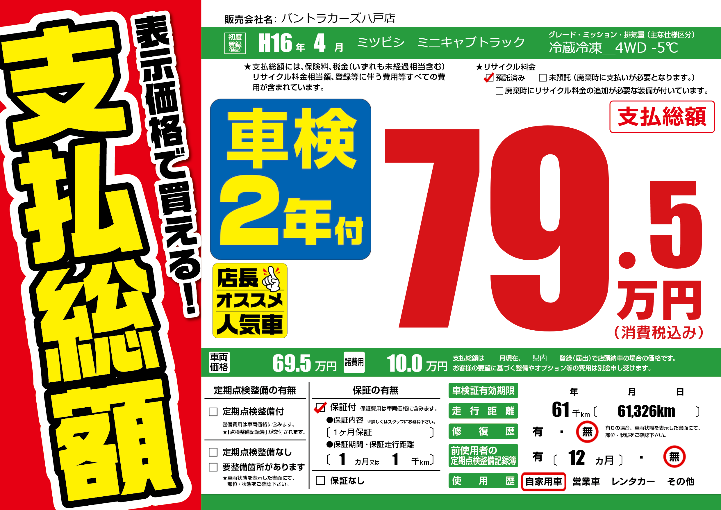 | 走行キロ | 6.1万km | 初年度登録 | H16年4月 |