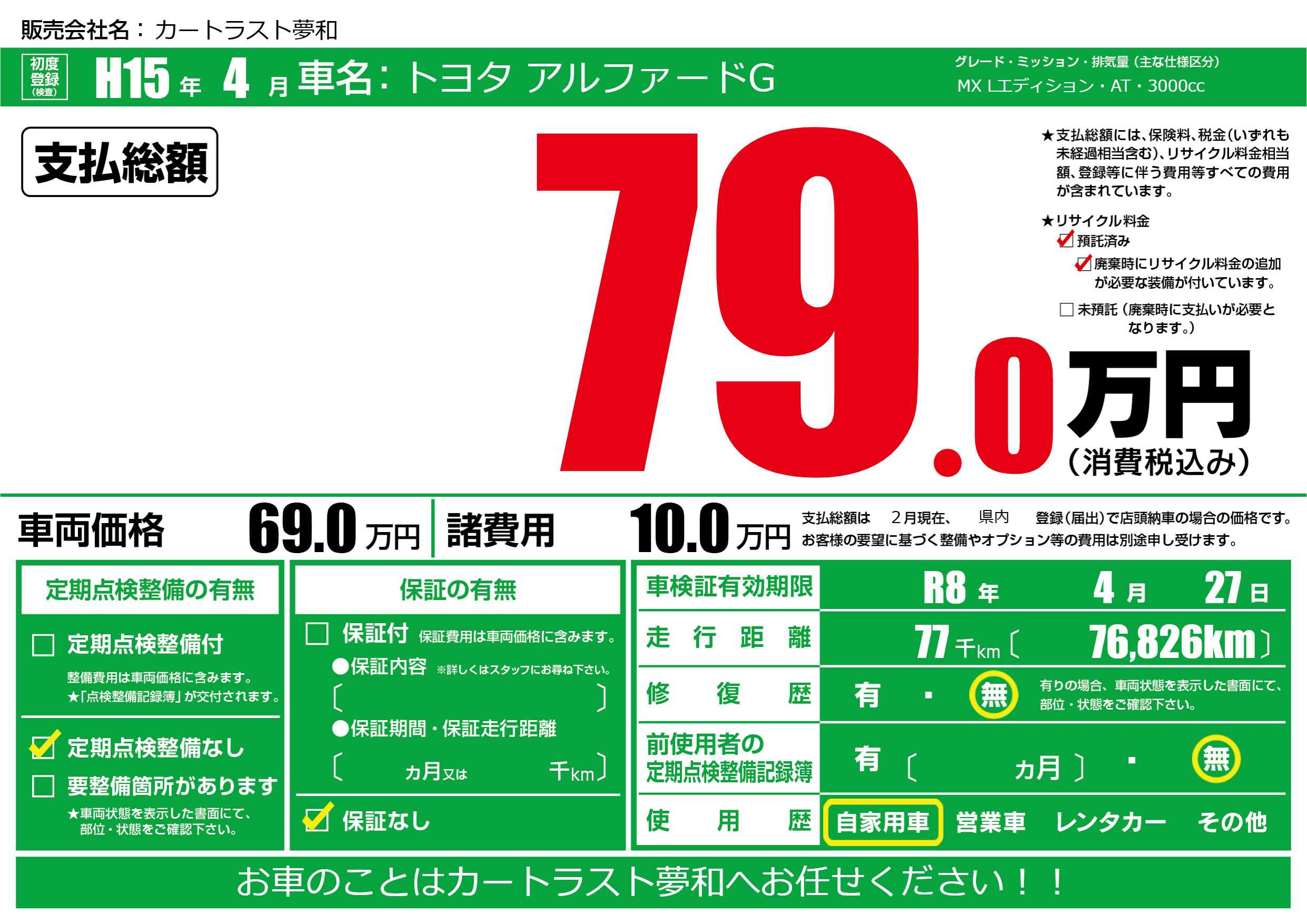 | 走行キロ | 7.7万km | 初年度登録 | H15年4月 |