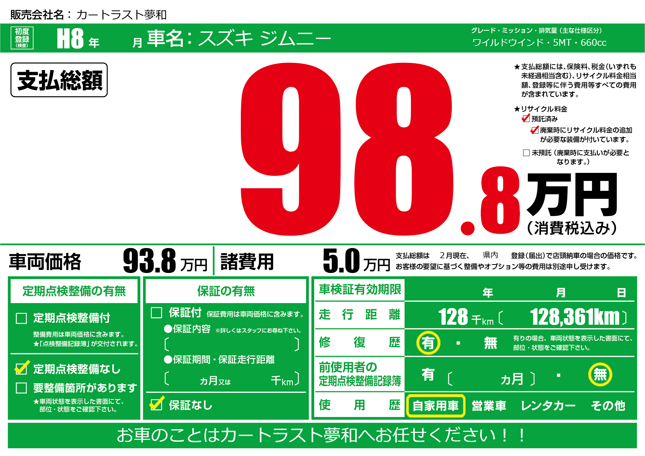 | 走行キロ | 12.8万km | 初年度登録 | H8年---月 |