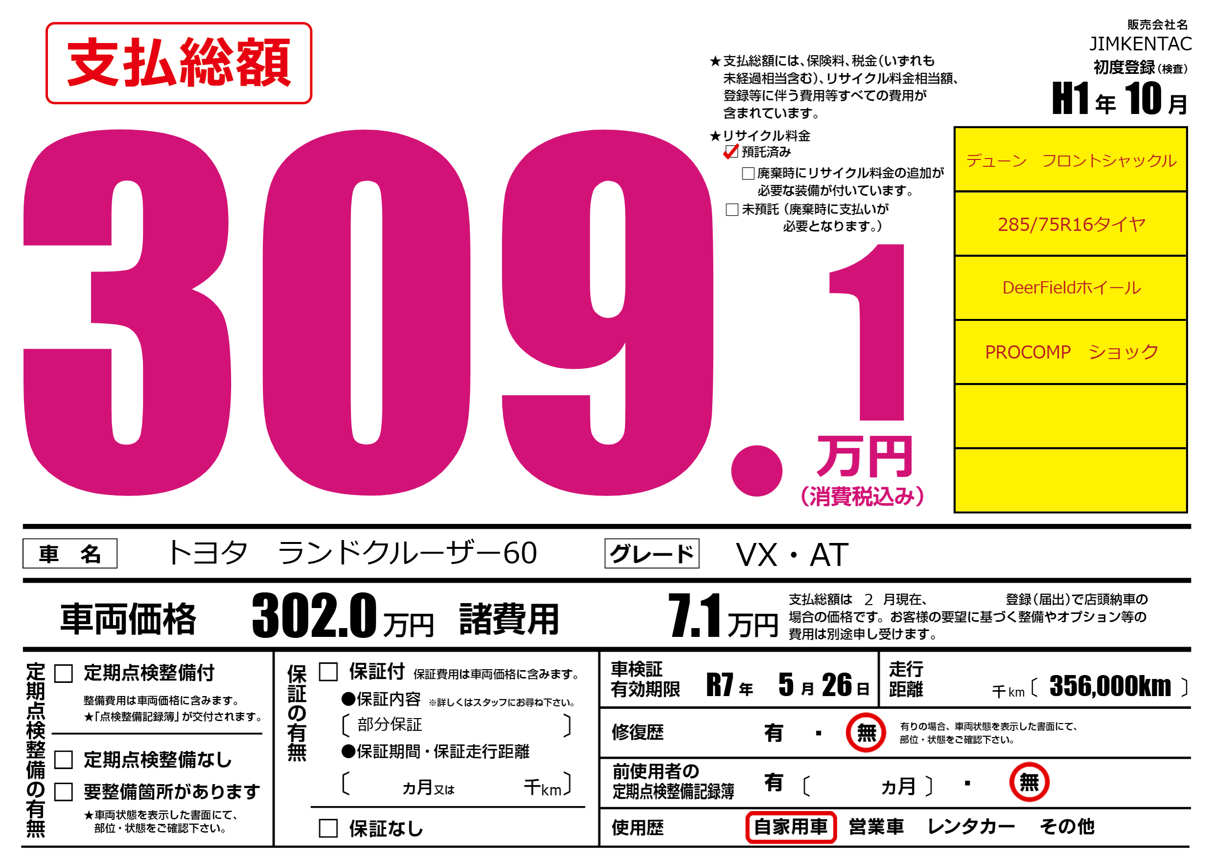 | 車名 | トヨタ ランドクルーザー60 | グレード ミッション 排気量 |