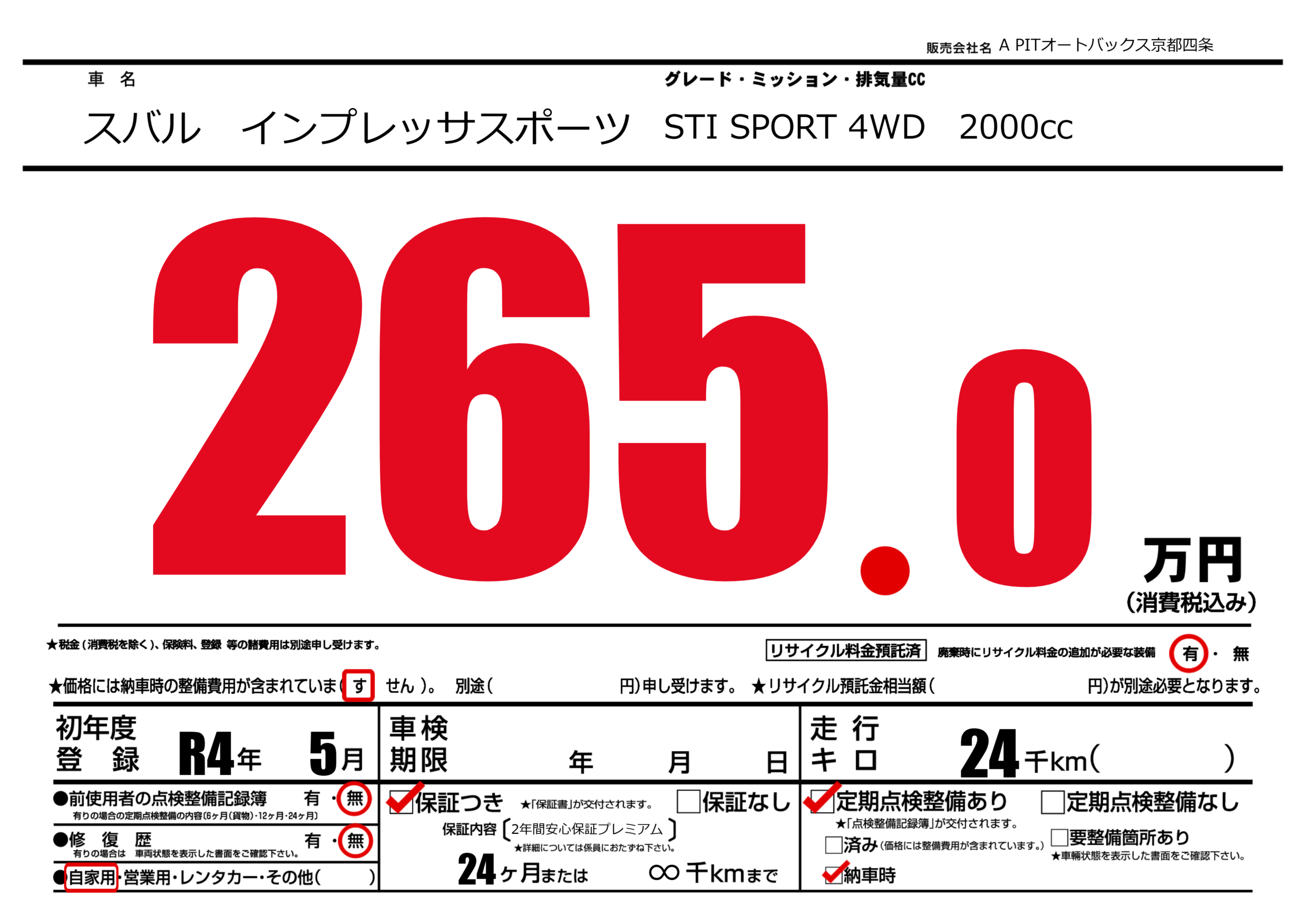 | 車名 | スバル インプレッサスポーツ | グレード ミッション 排気量 |