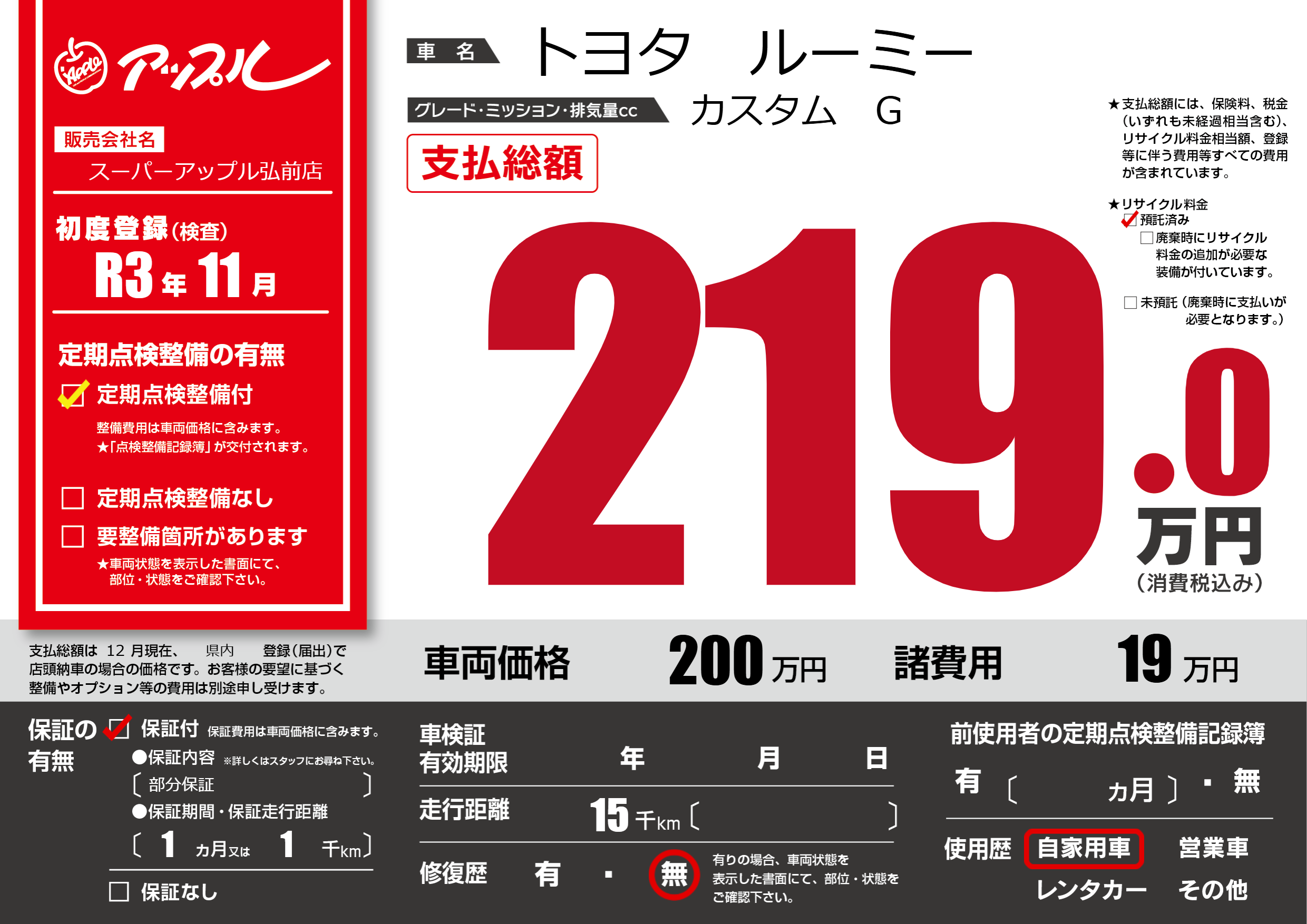 | 車名 | トヨタ ルーミー | グレード ミッション 排気量 |