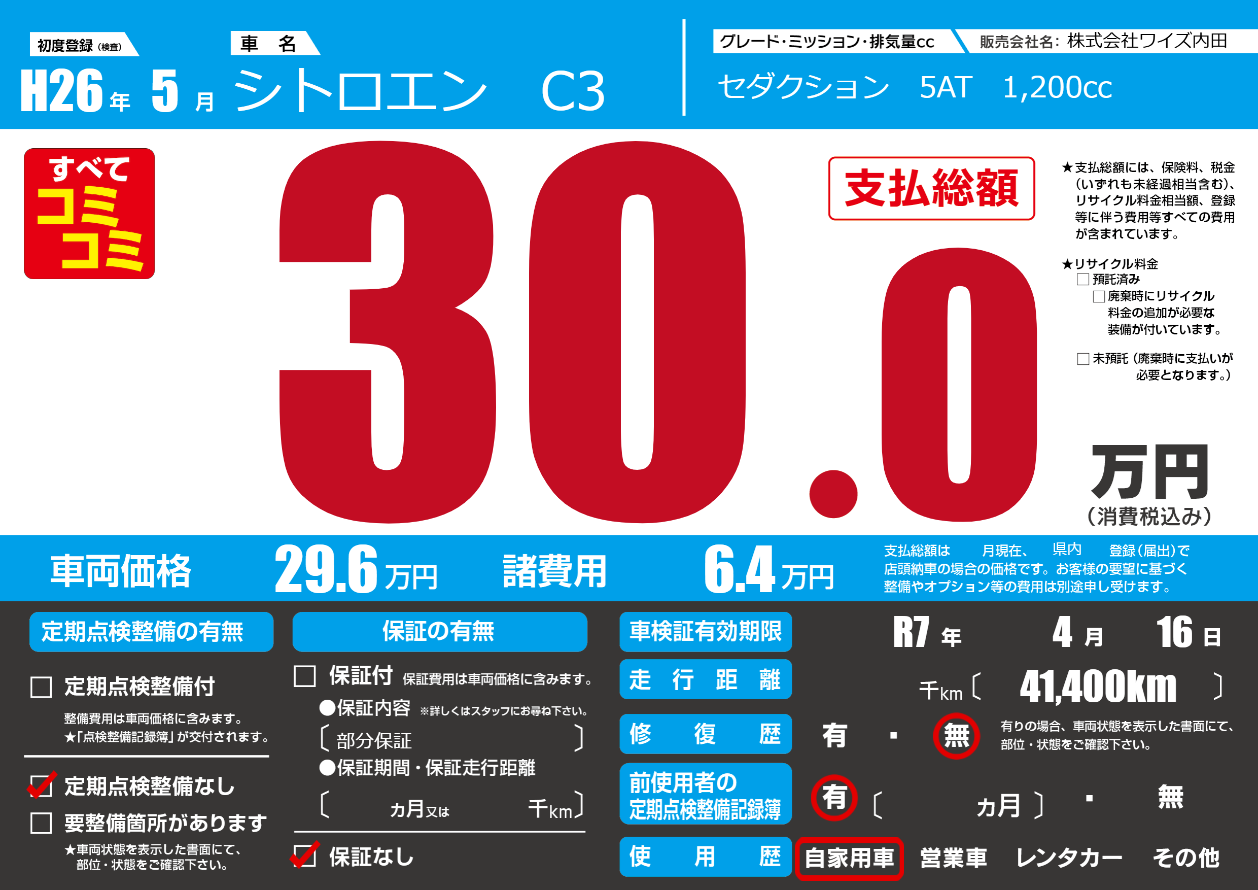 | 走行キロ | - | 初年度登録 | H26年5月 |