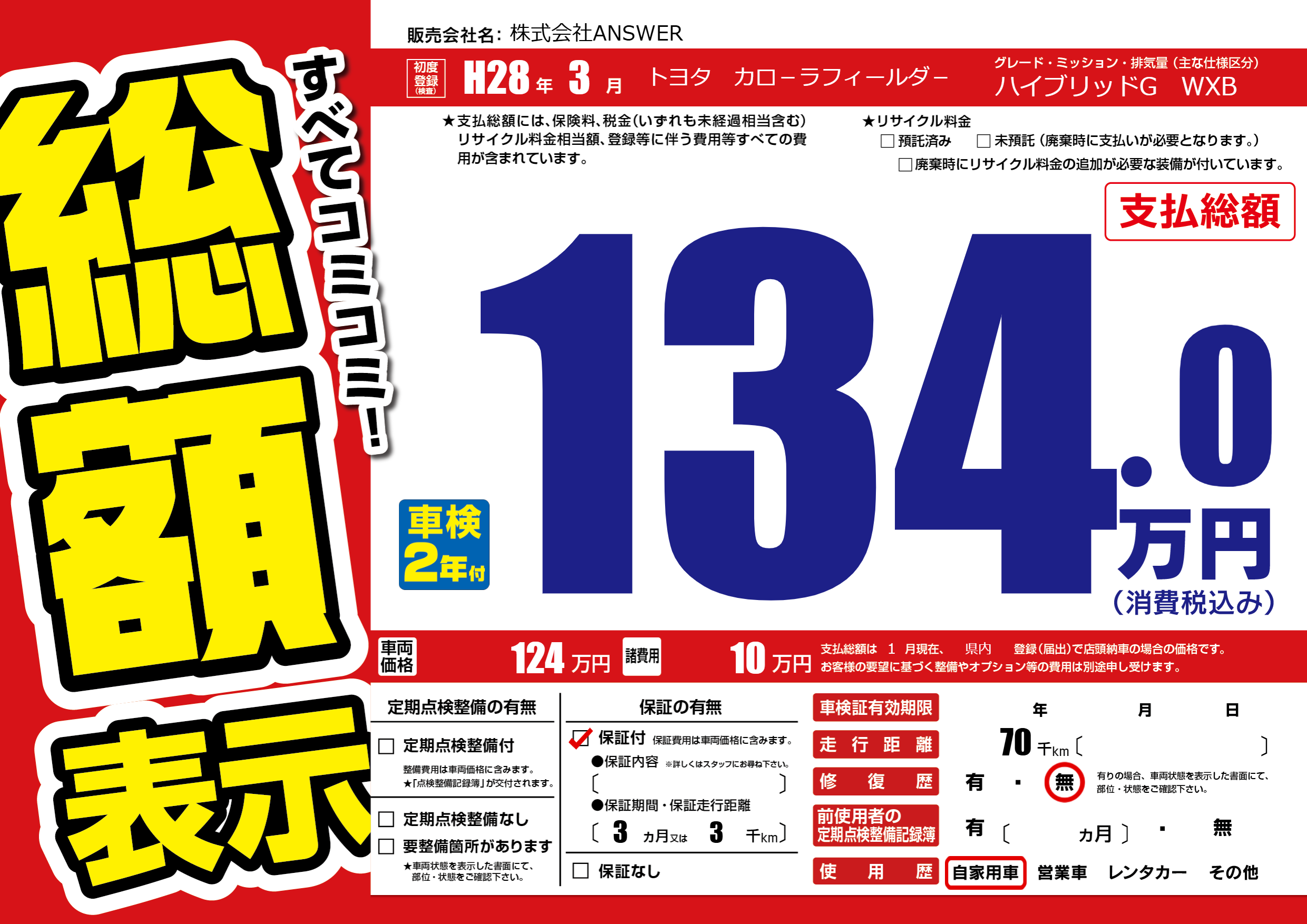 | 車名 | トヨタ カロ-ラフィールダ- | グレード ミッション 排気量 |