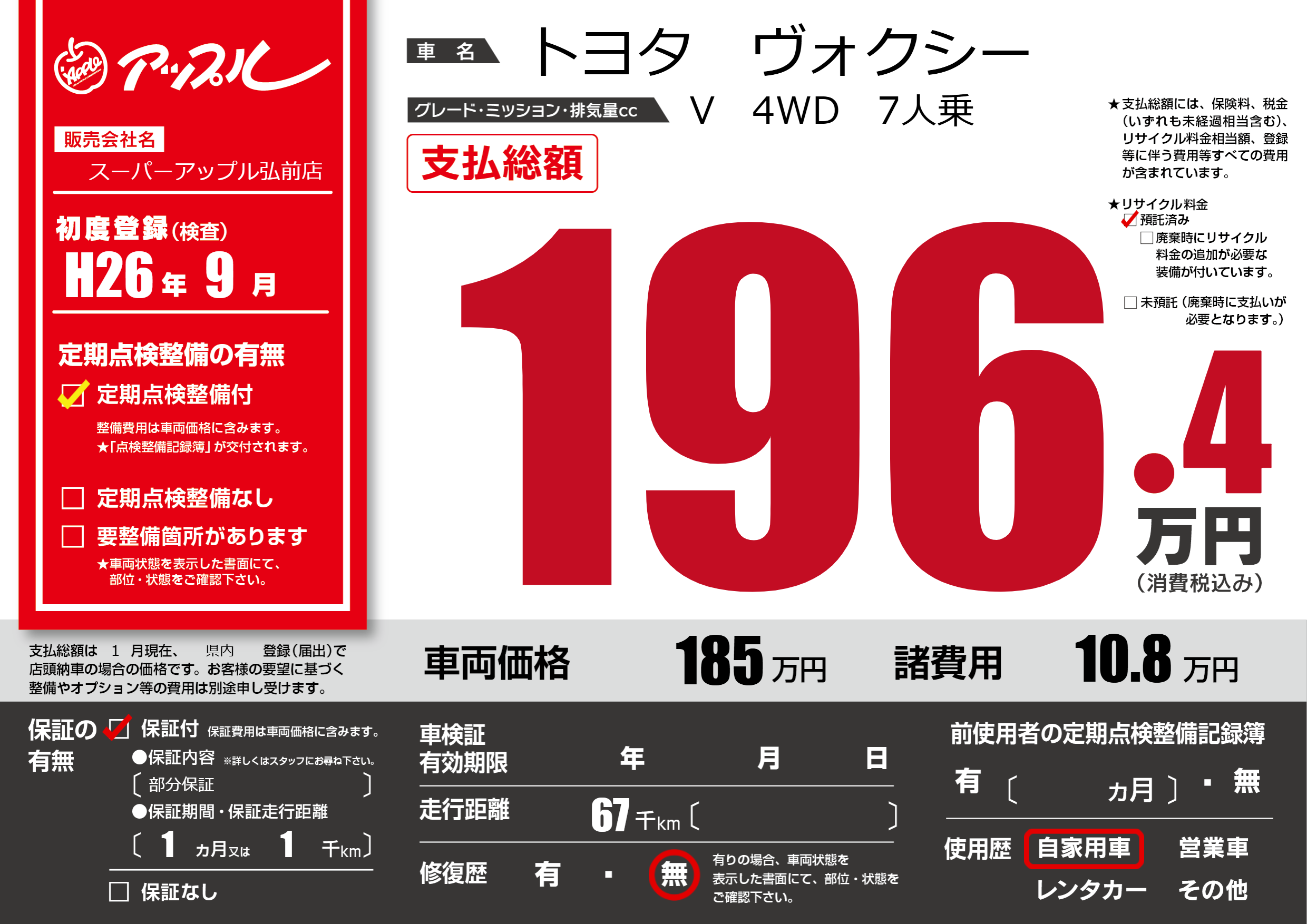 | 走行キロ | 6.7万km | 初年度登録 | H26年9月 |