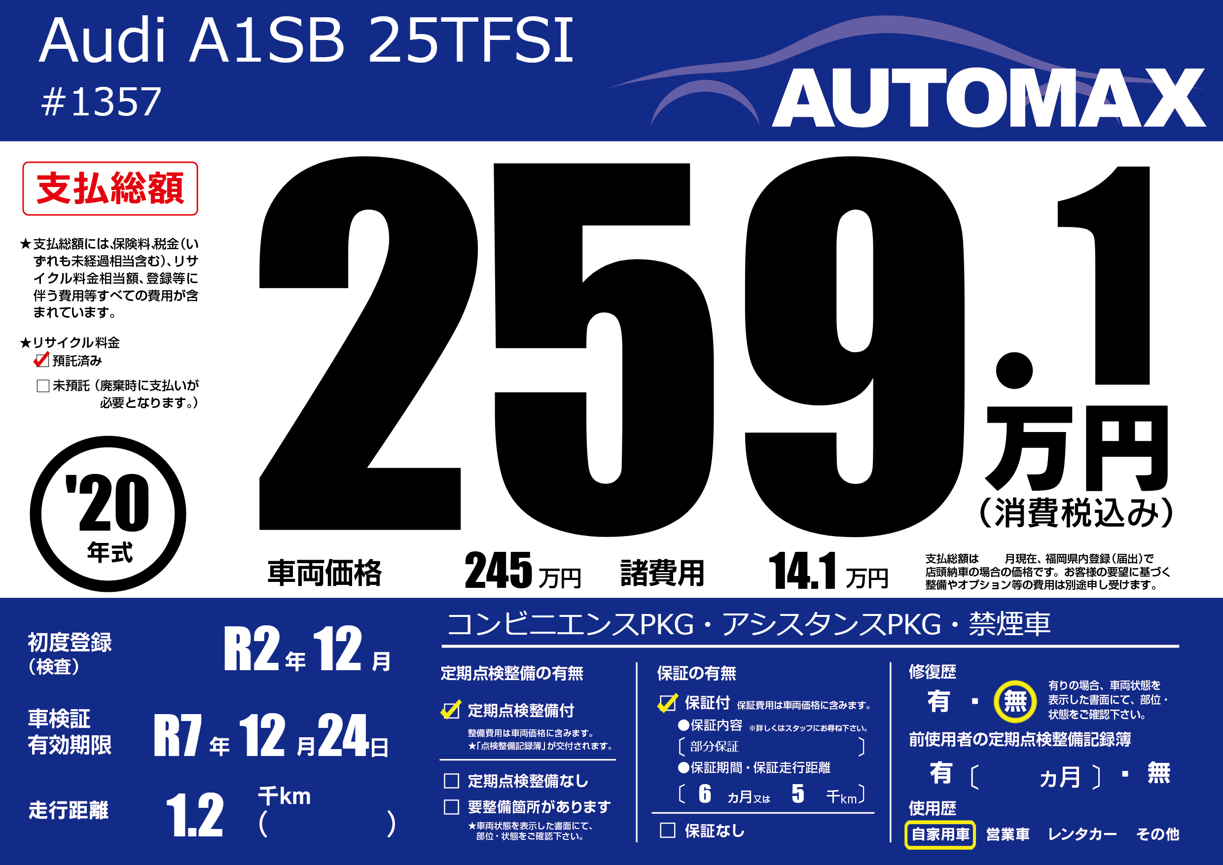 | 車名 | Audi A1SB 25TFSI | グレード ミッション 排気量 |