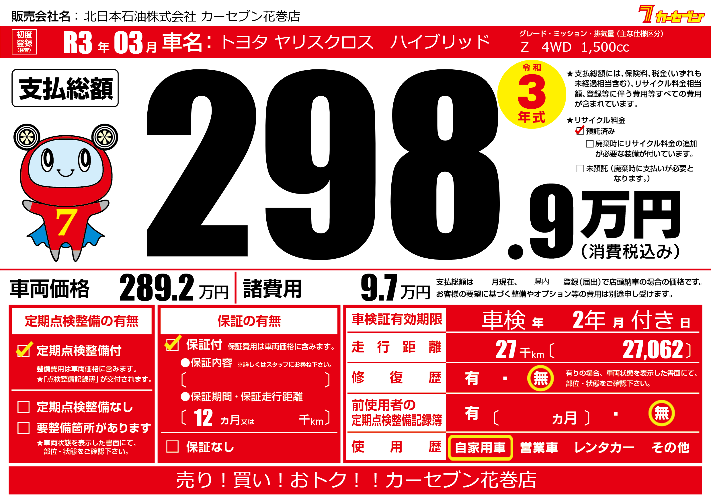 | 走行キロ | 2.7万km | 初年度登録 | R3年03月 |