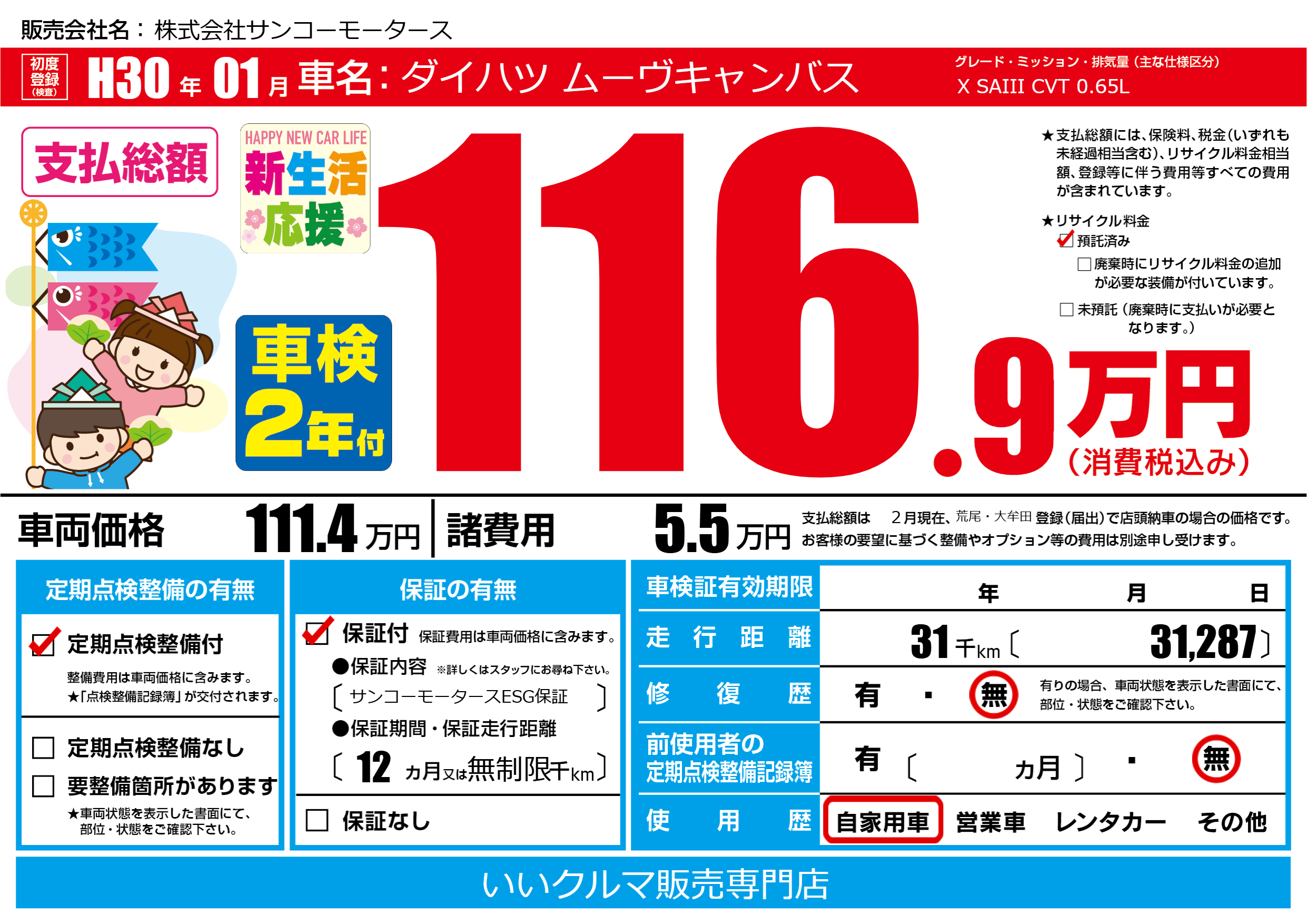 保証付き 保証内容(サンコーモータースESG保証) 12ヶ月または(無制限)千kmまで |