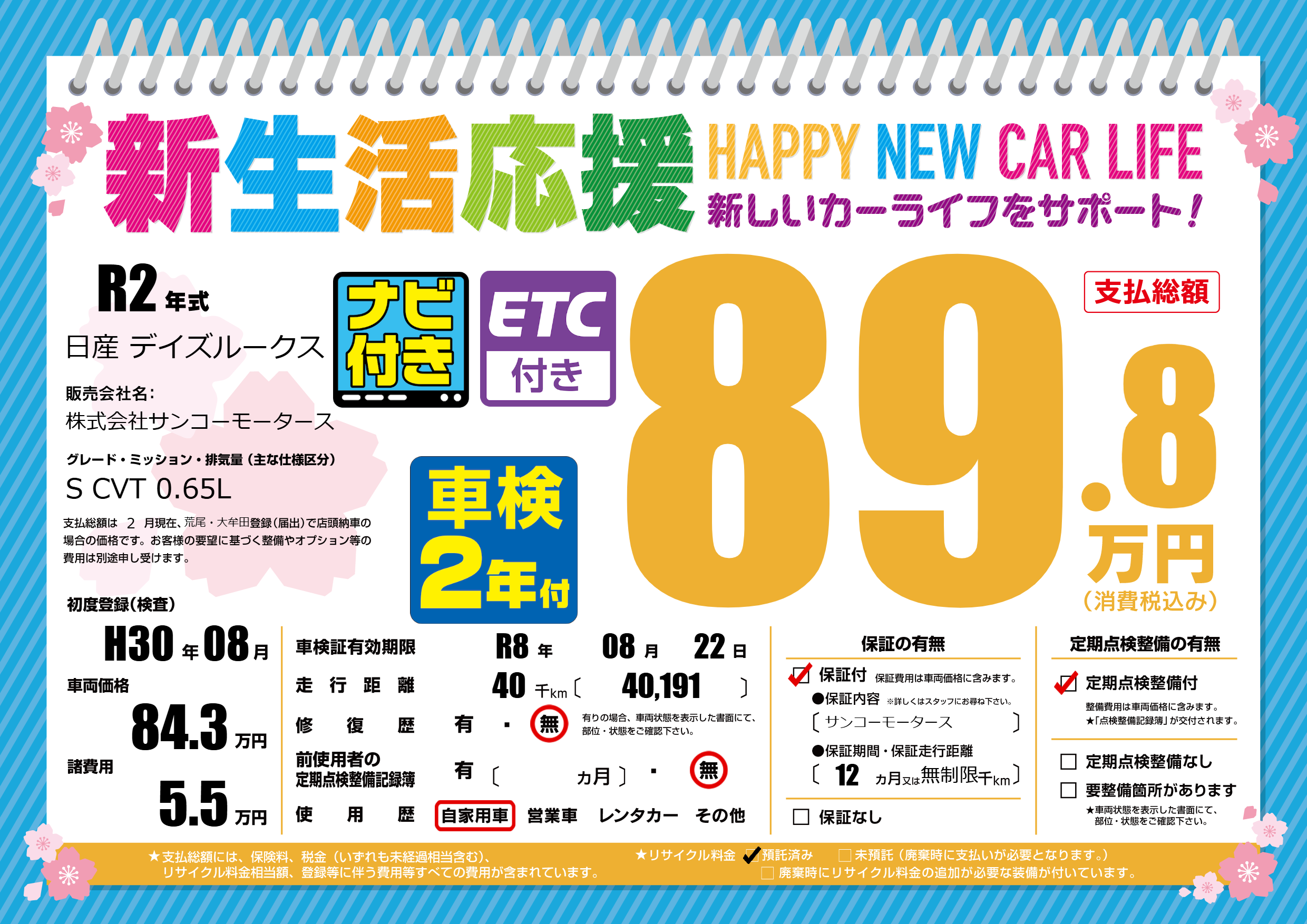 保証付き 保証内容(サンコーモータース) 12ヶ月または(無制限)千kmまで |