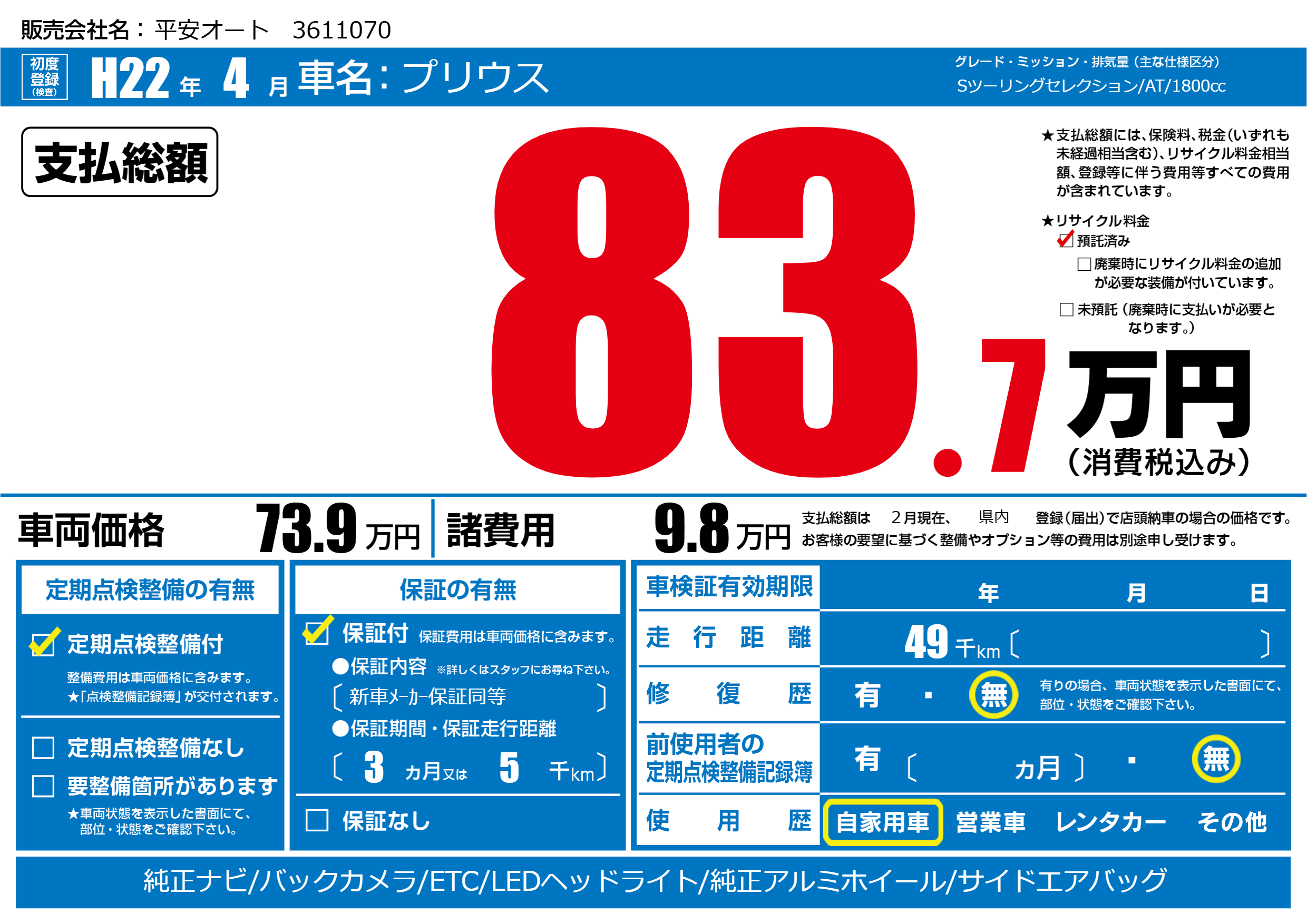 | 車名 | プリウス | グレード ミッション 排気量 |