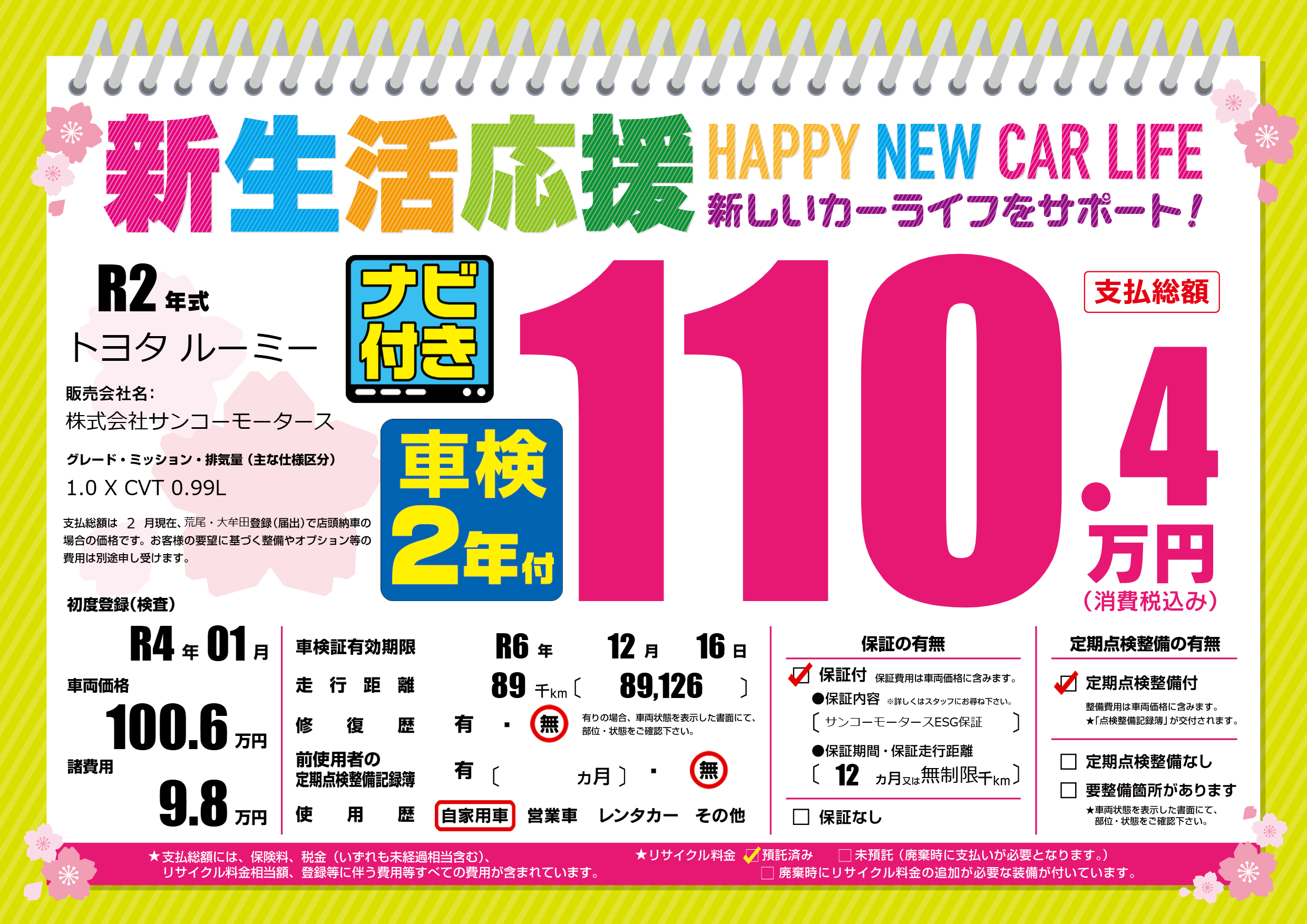 | 車名 | トヨタ ルーミー | グレード ミッション 排気量 |