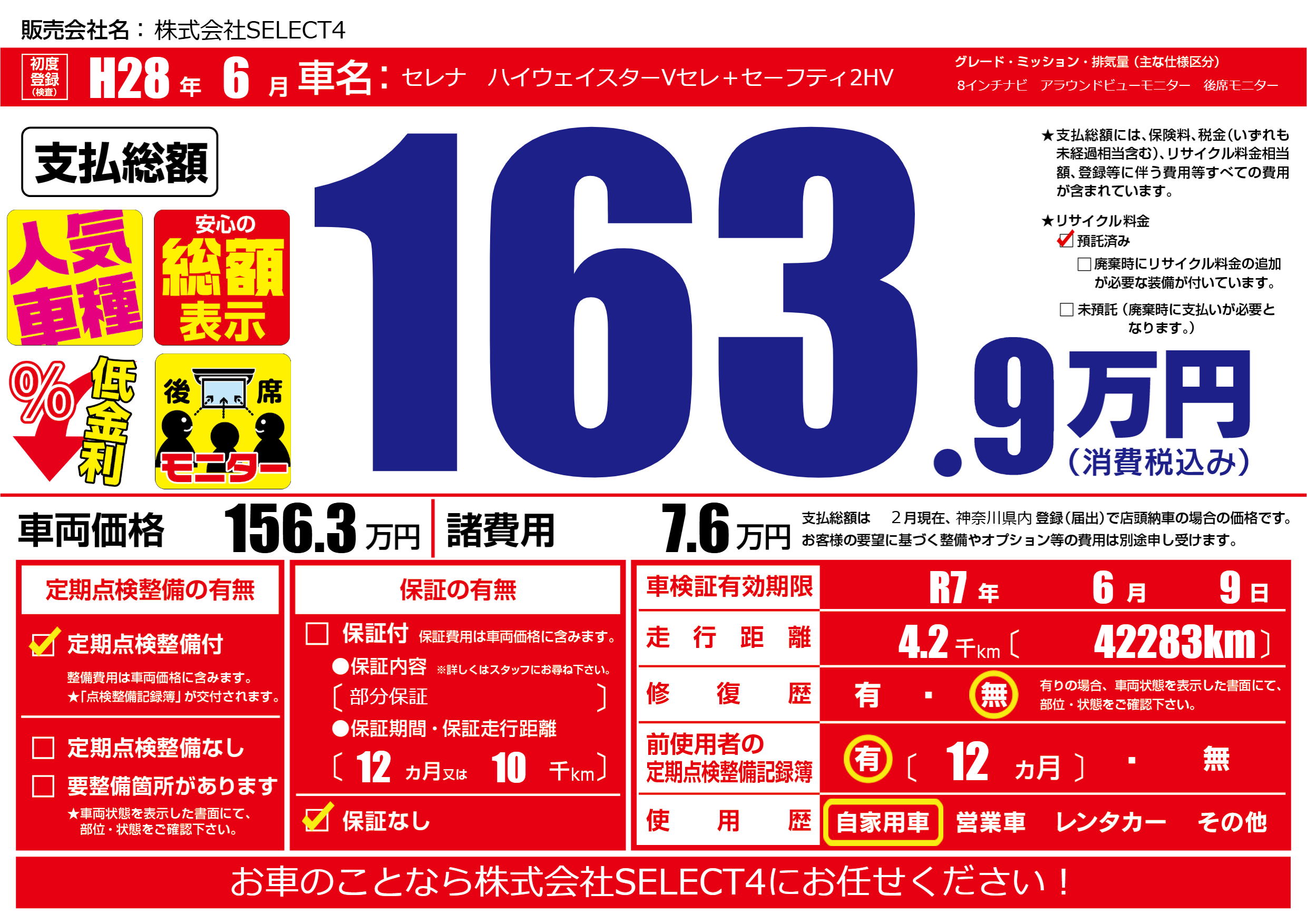 | 走行キロ | 0.4万km | 初年度登録 | H28年6月 |