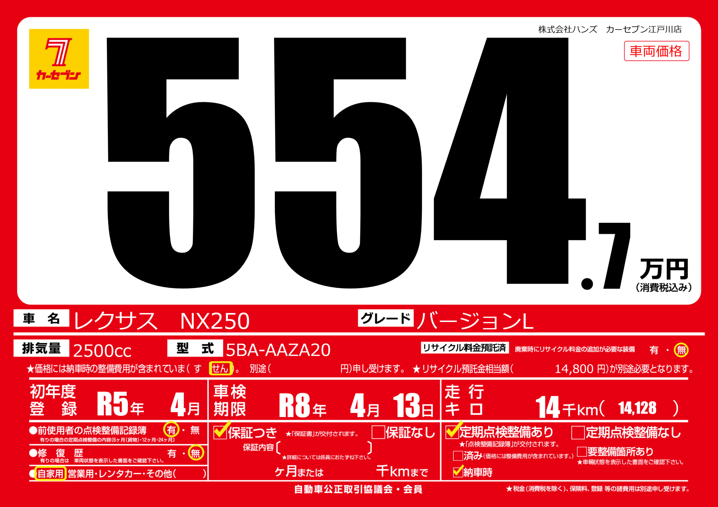 | 車名 | レクサス NX250 | グレード ミッション 排気量 |