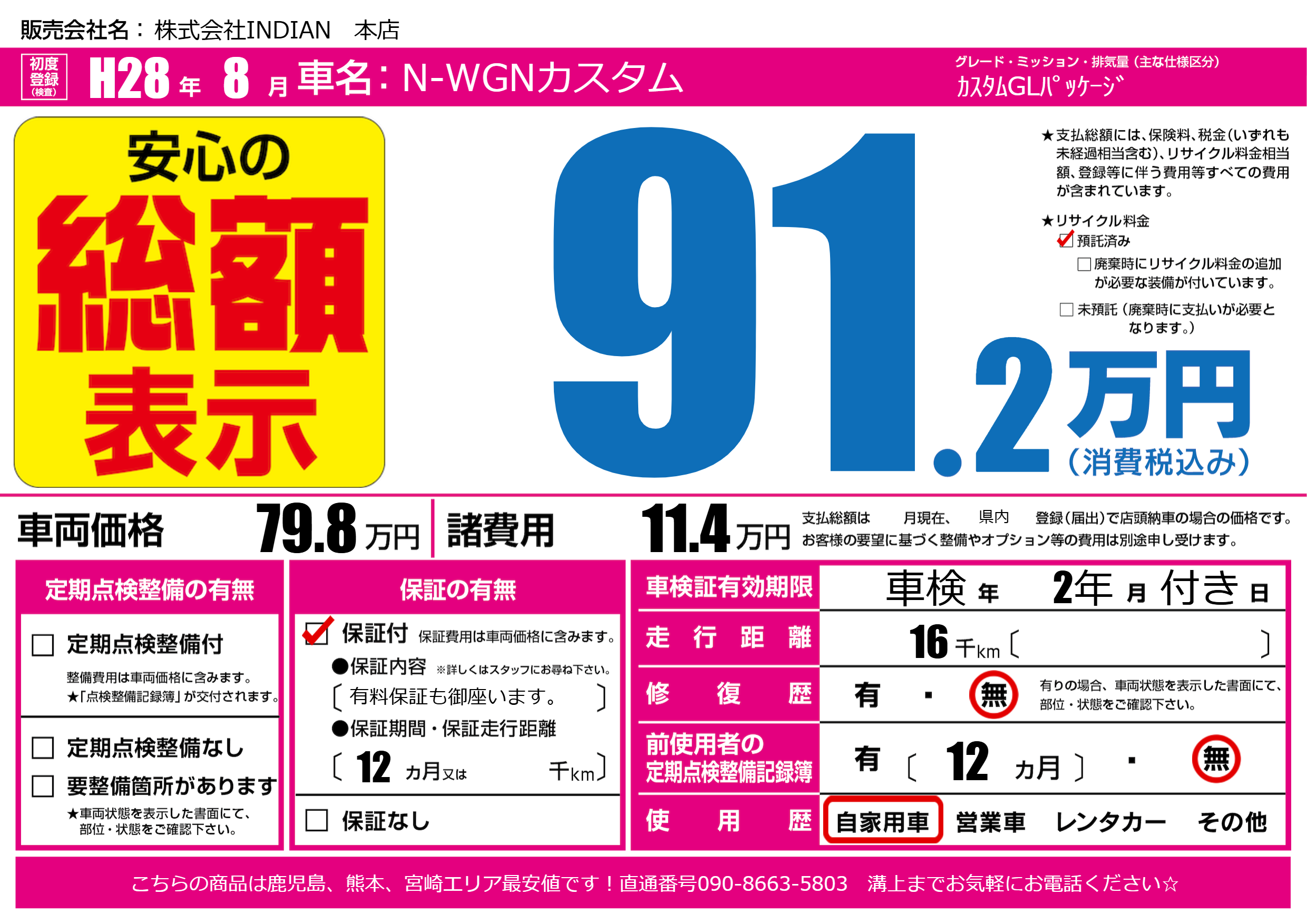 | 走行キロ | 1.6万km | 初年度登録 | H28年8月 |