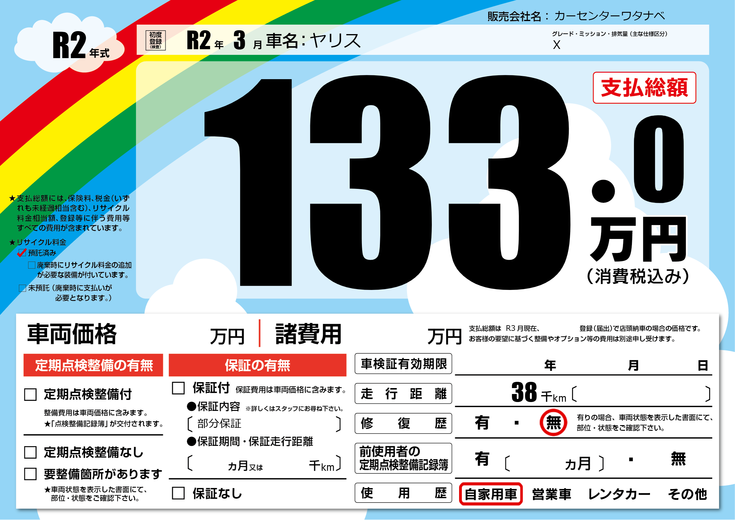| 走行キロ | 3.8万km | 初年度登録 | R2年3月 |