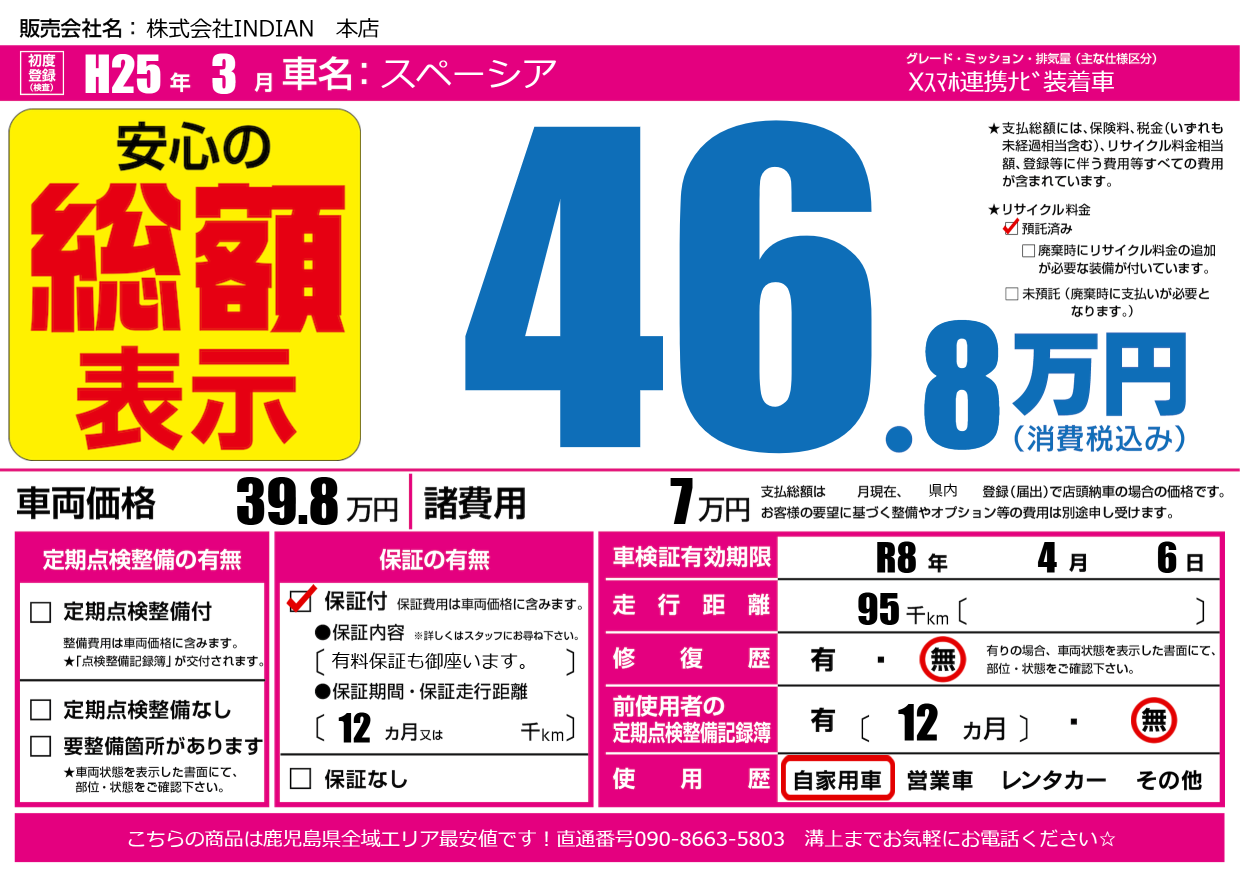 | 走行キロ | 9.5万km | 初年度登録 | H25年3月 |