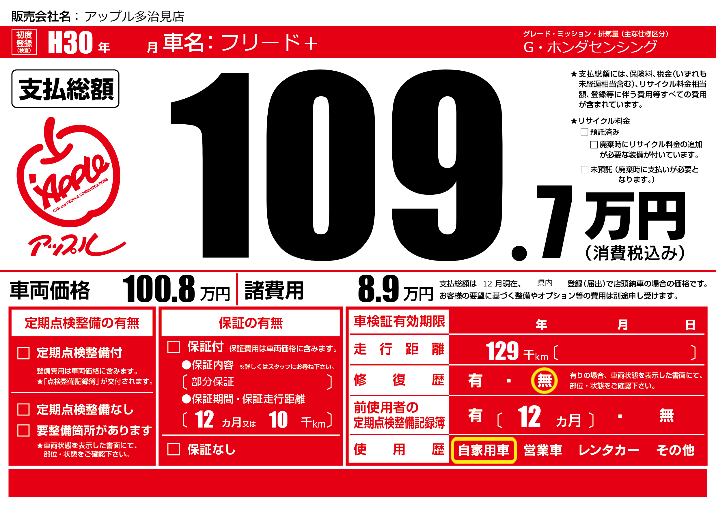 | 走行キロ | 12.9万km | 初年度登録 | H30年---月 |