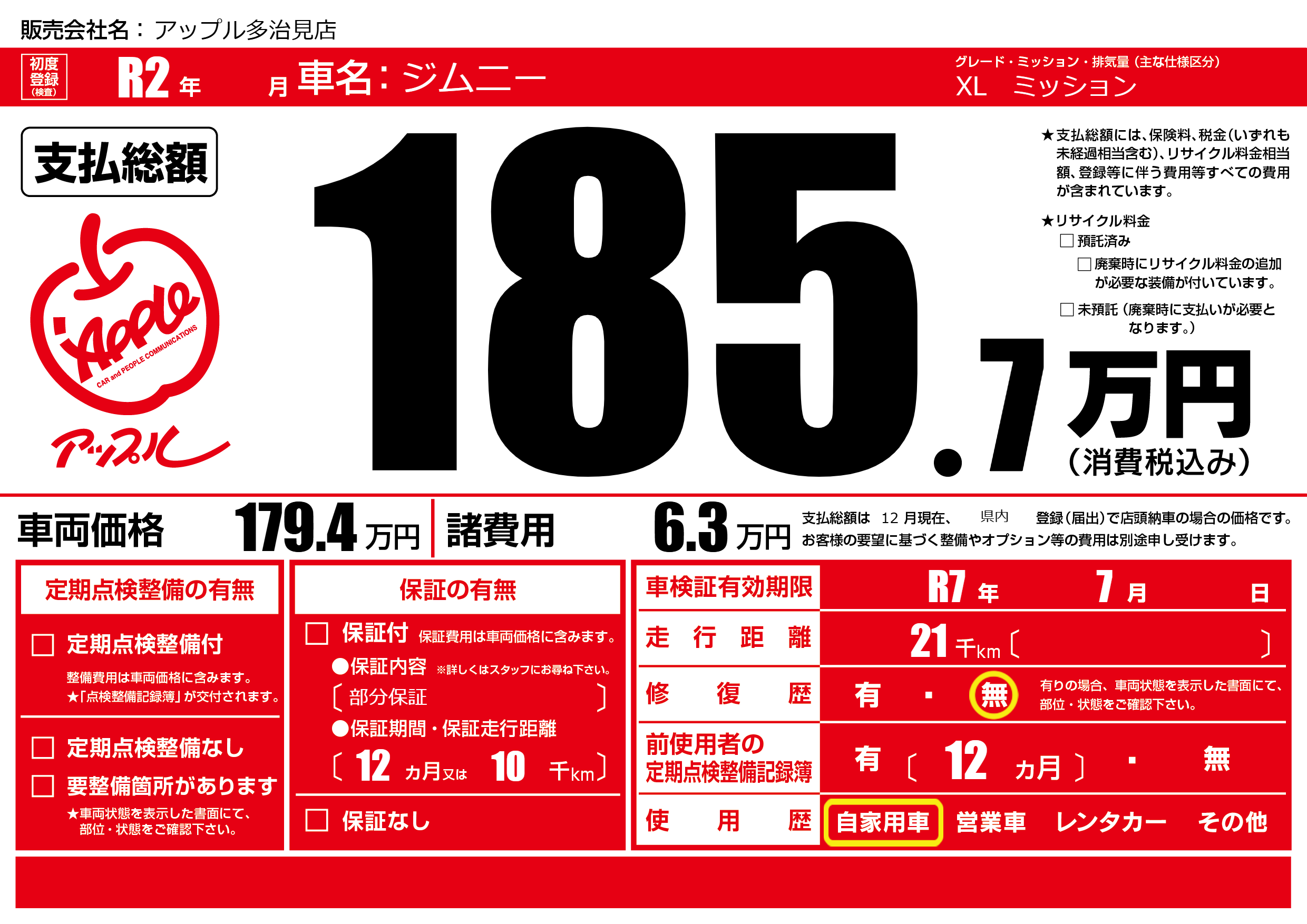 | 車名 | ジムニー | グレード ミッション 排気量 |