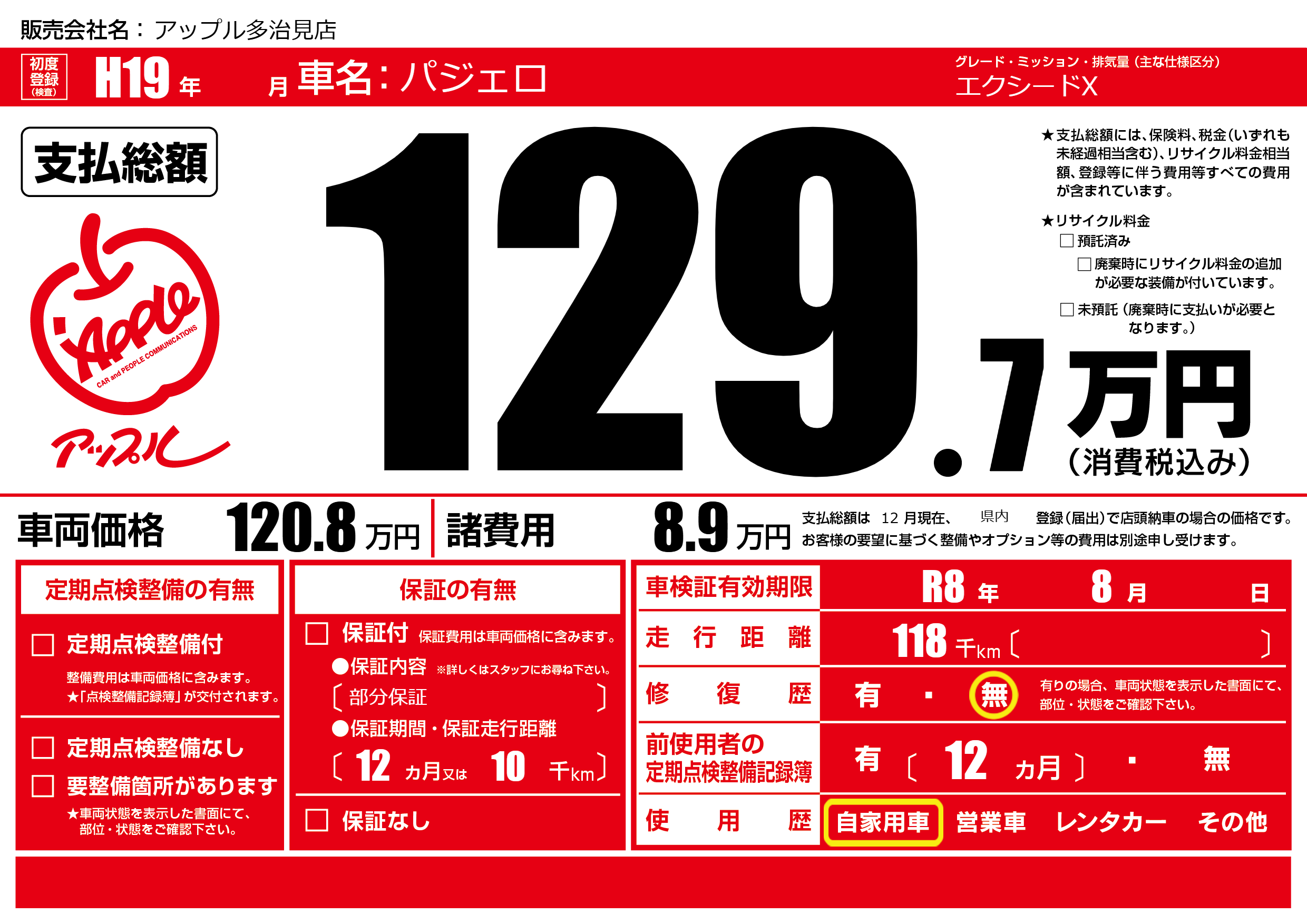 | 車名 | パジェロ | グレード ミッション 排気量 |