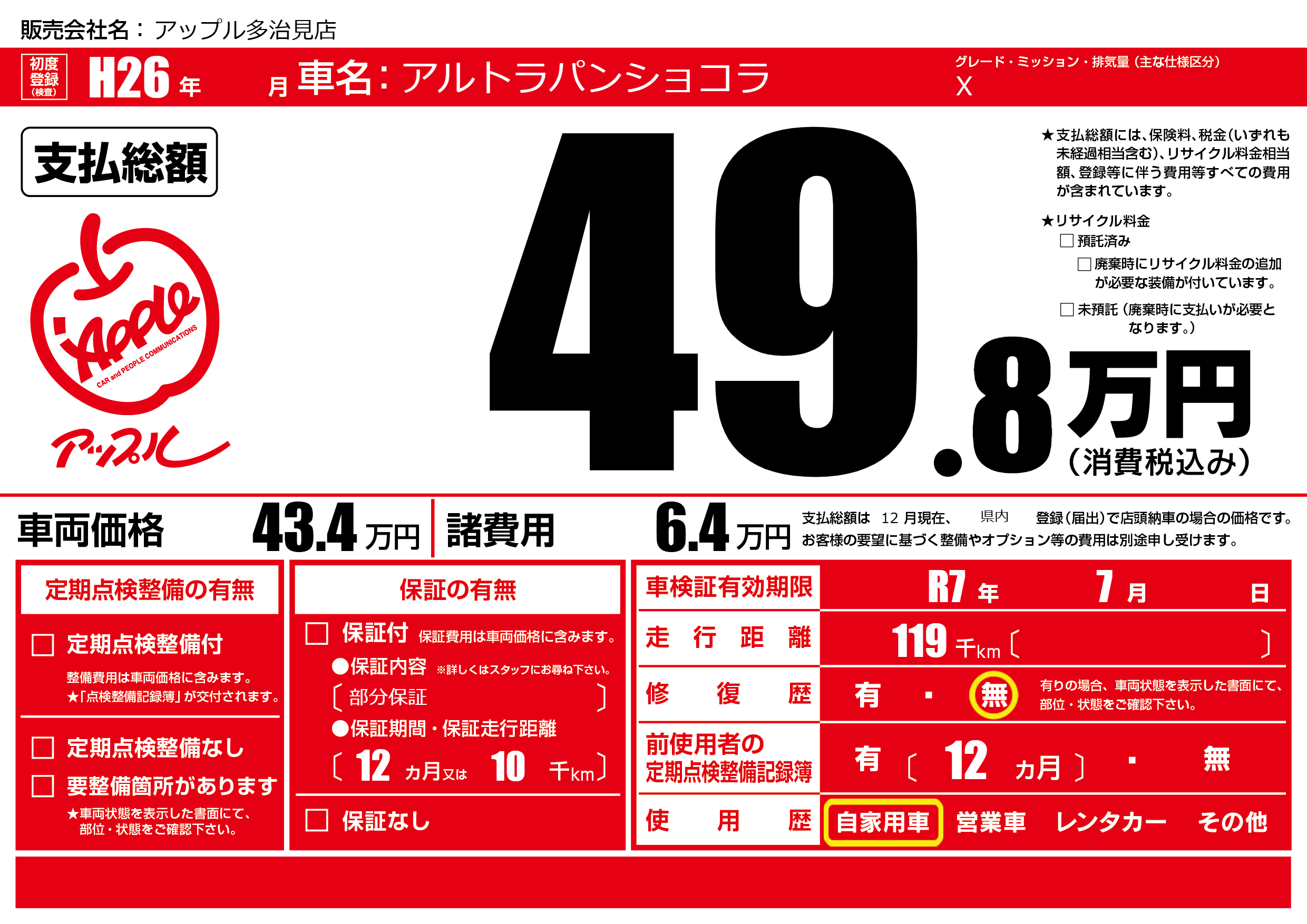 | 車検制限 | R7年 7月 - 日 | ||