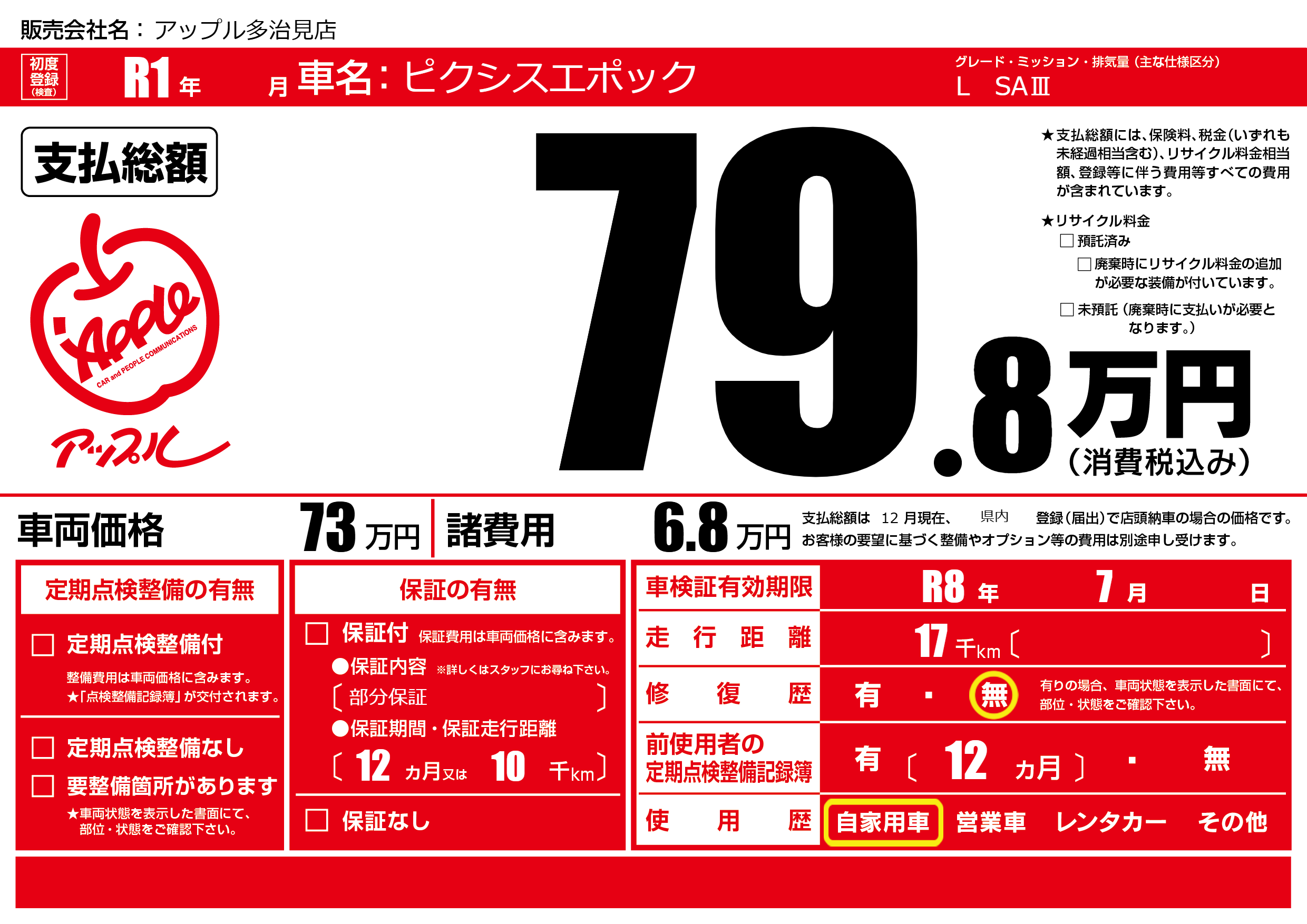| 車検制限 | R8年 7月 - 日 | ||