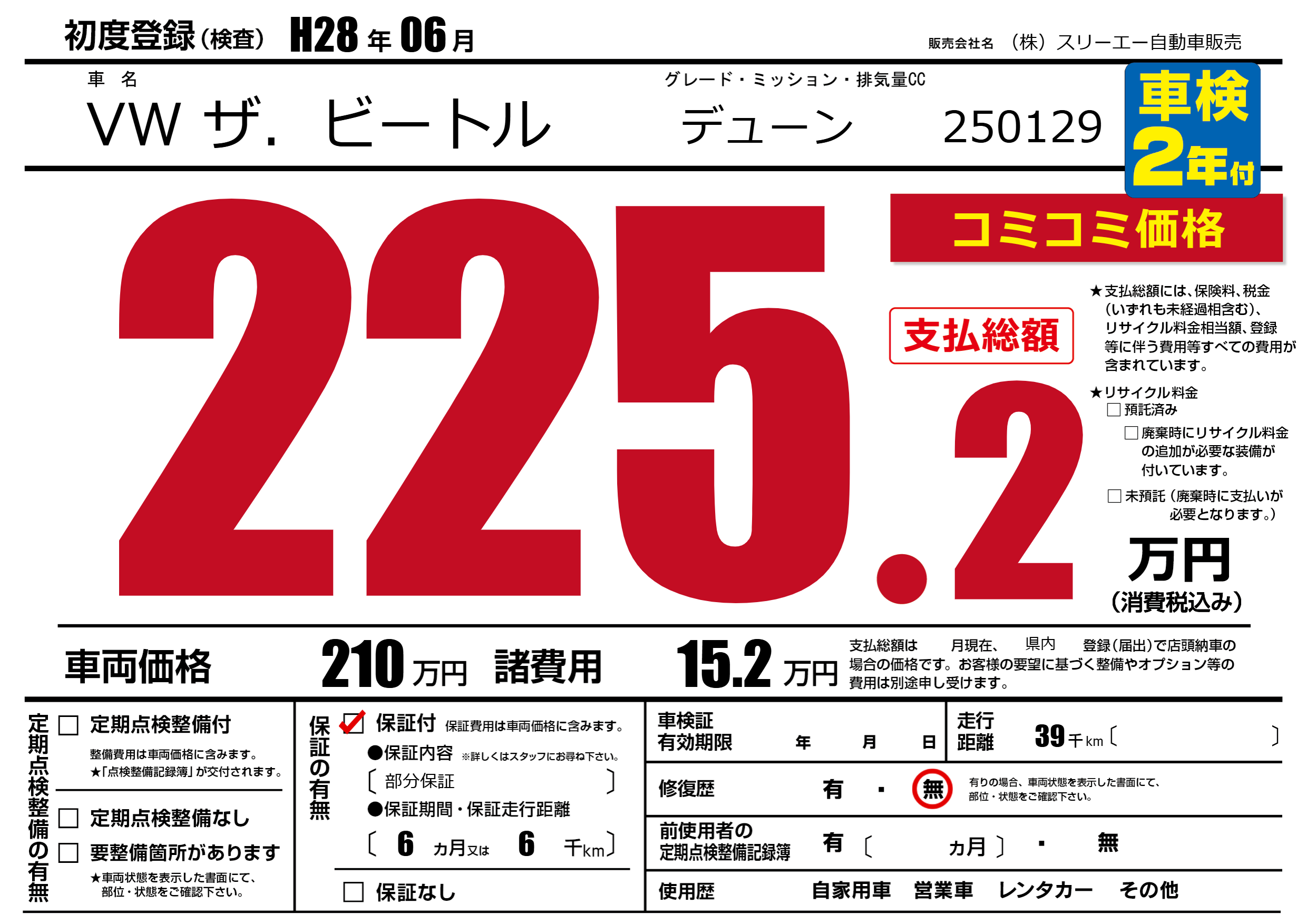 | 車名 | VW ザ.ビートル | グレード ミッション 排気量 |