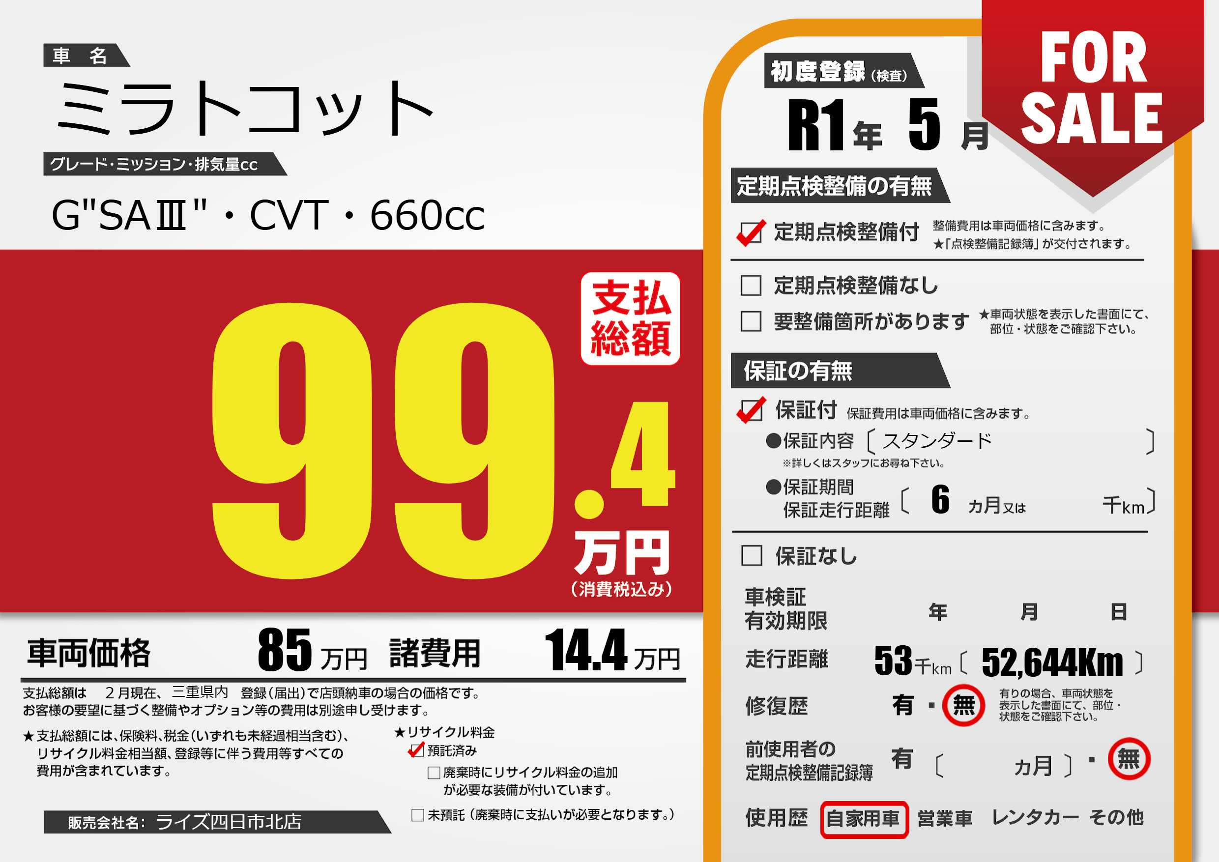 | 車名 | ミラトコット | グレード ミッション 排気量 |