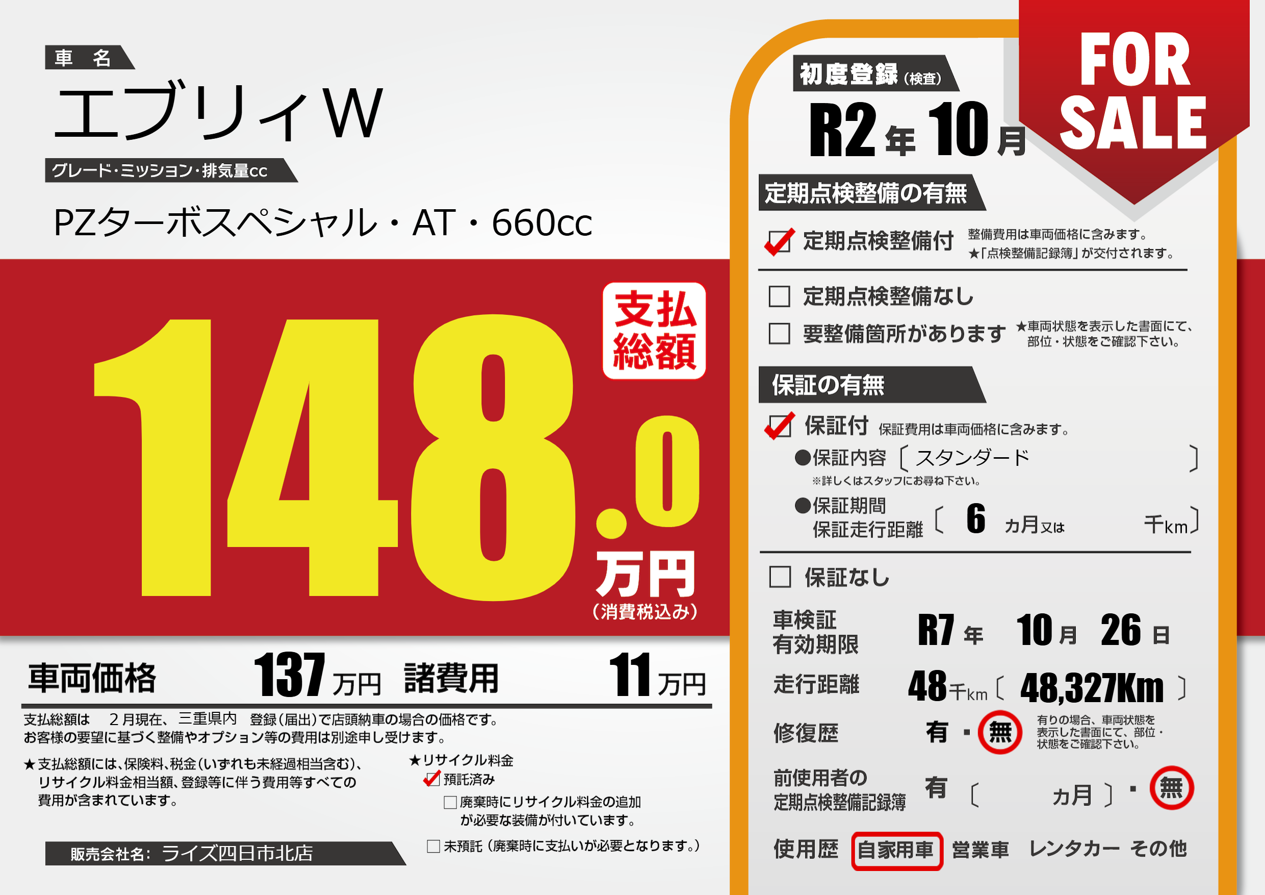 なし | 車検制限 | R7年10月26月 |